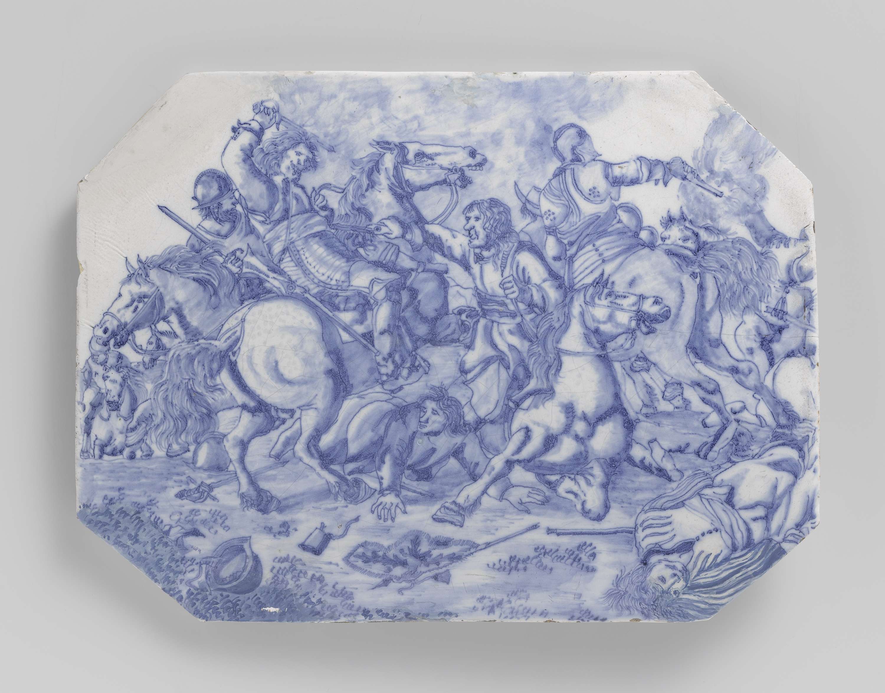 Plaat, achthoekig, beschilderd in blauw met een ruitergevecht. (Nederlands)