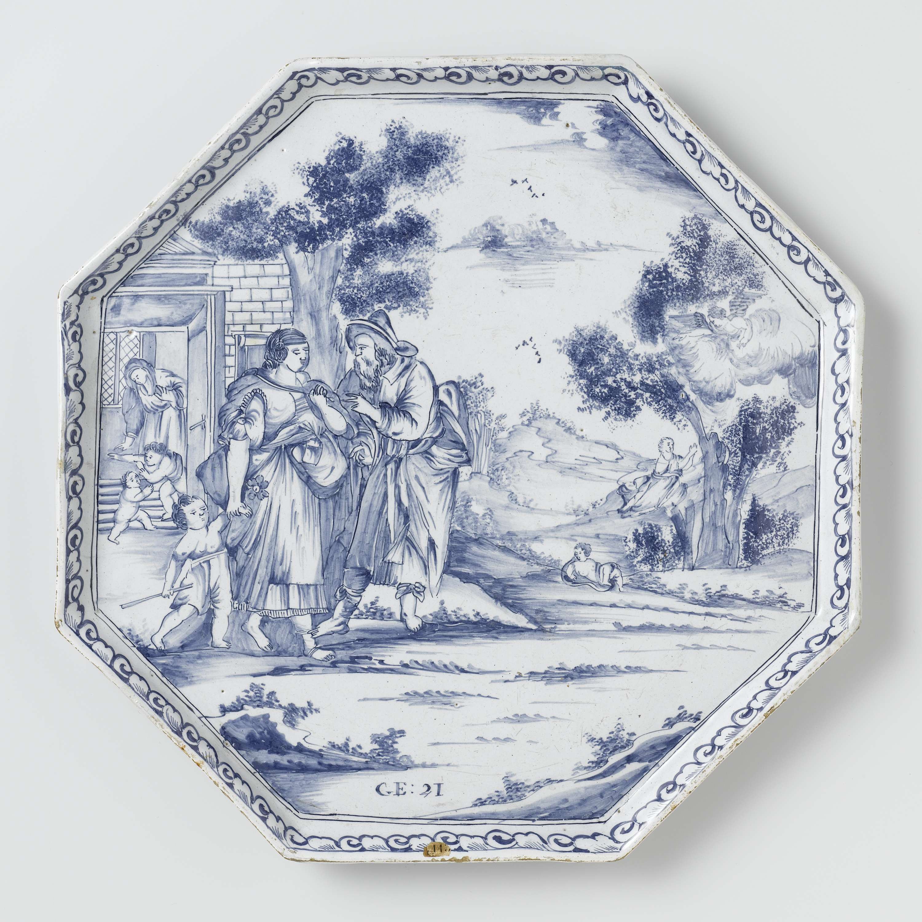 Blad van faïence. Blauw beschilderd met Abraham die Hagar wegstuurt (Nederlands)