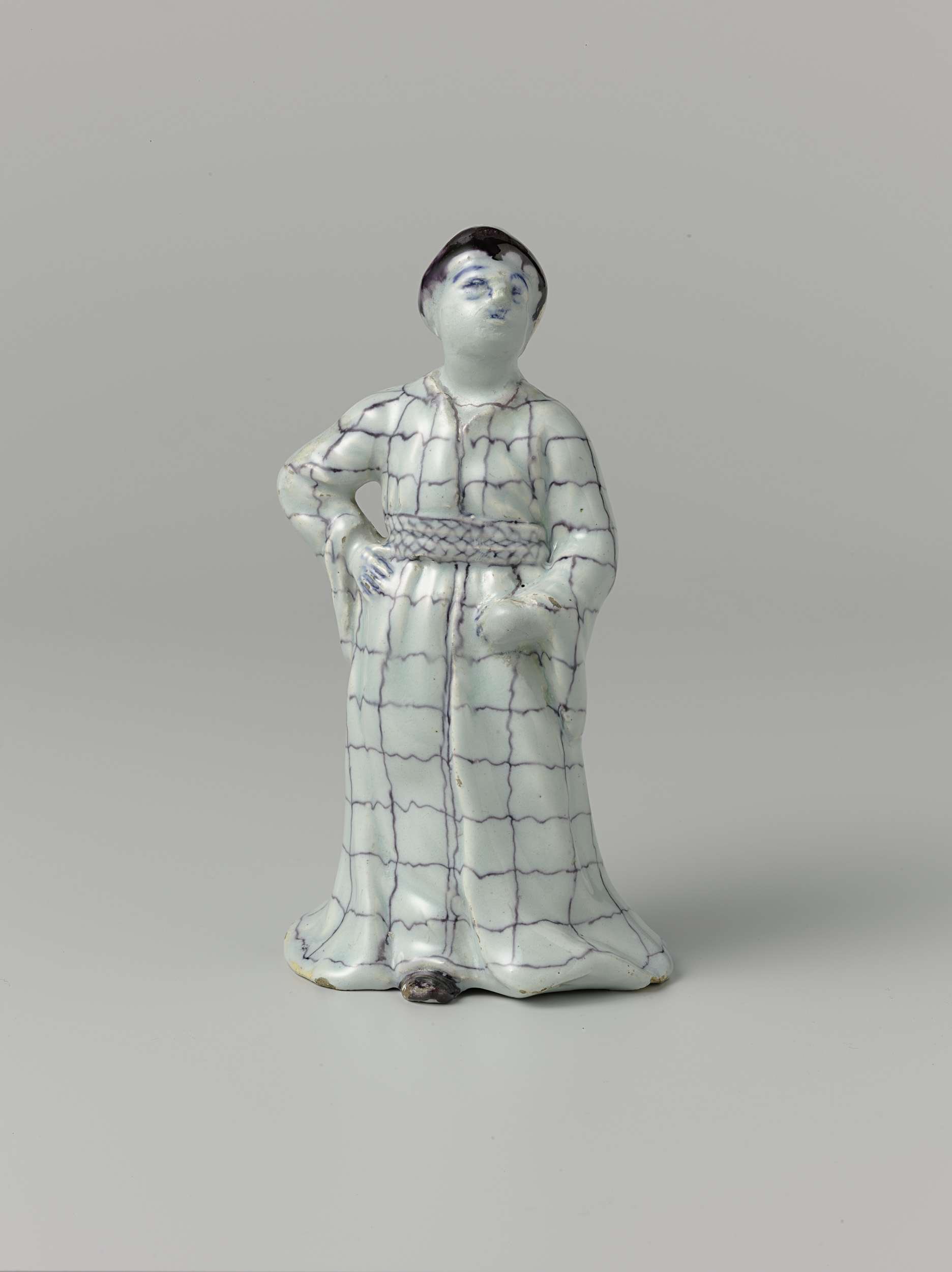 Vrouwenfiguur van faience, voorstellende een vrouw in een lange geruite kamerjapon. Veelkleurig beschilderd. (Nederlands)