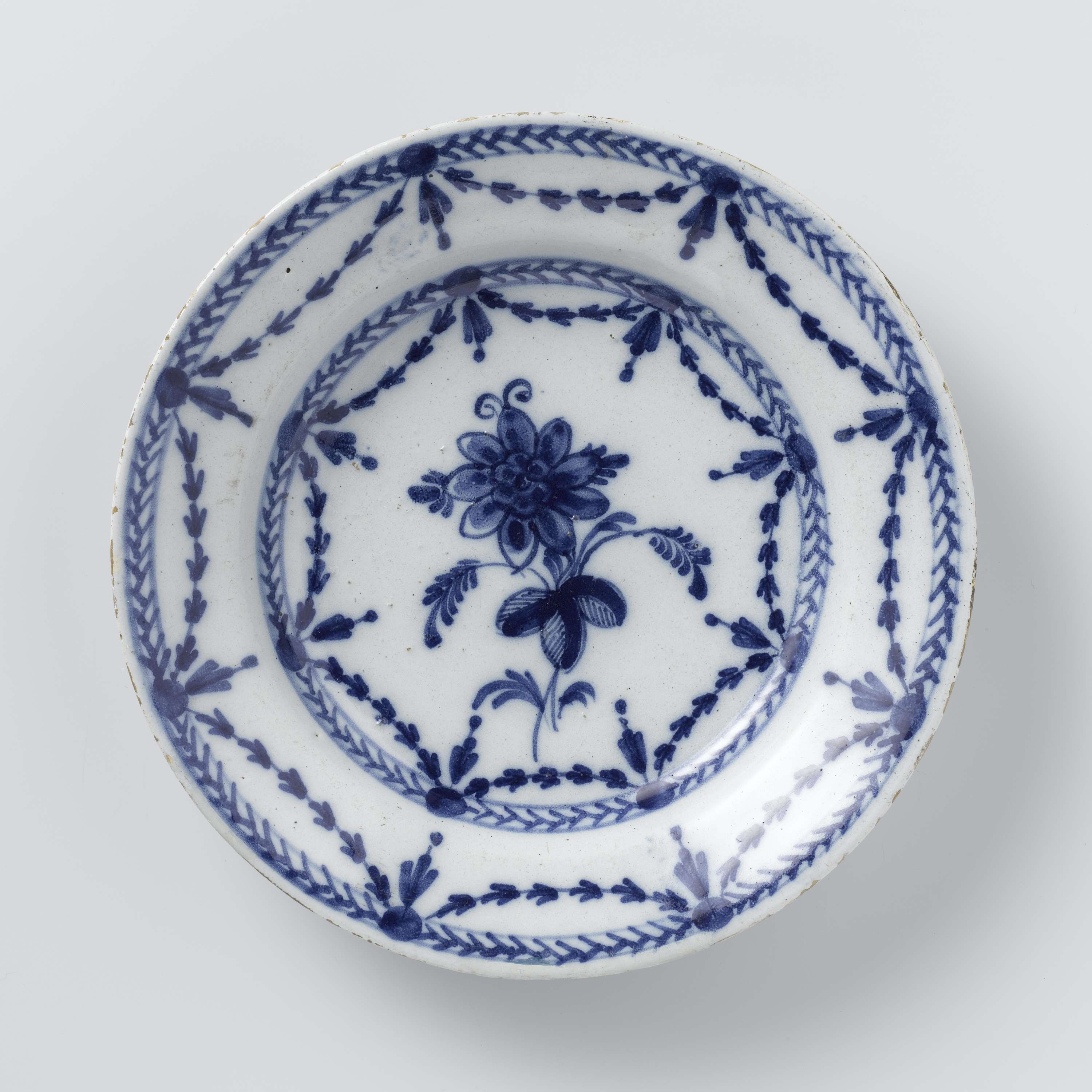 | Nederlands | Bord van fainece met bloem en guirlandes |