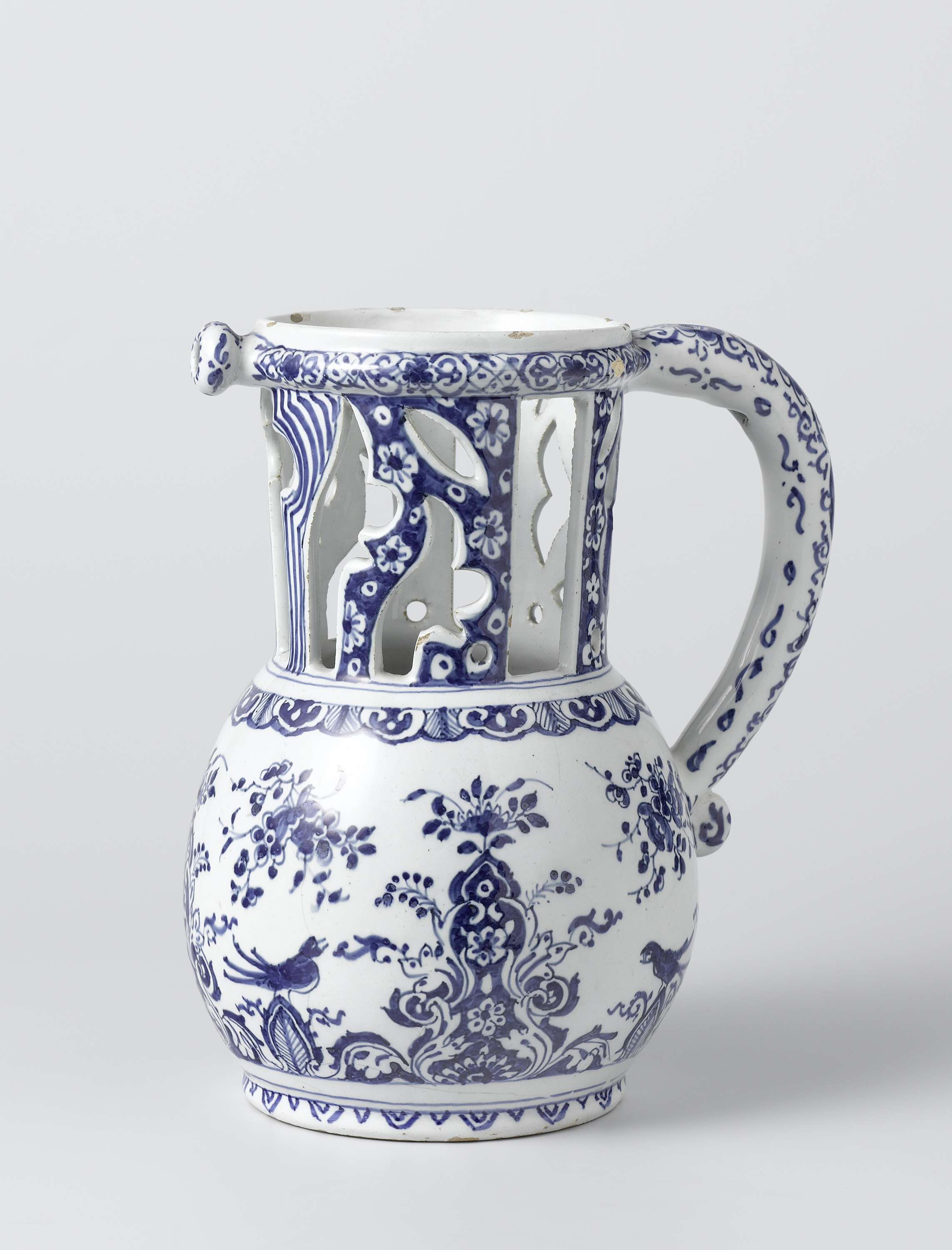 Fopkan van faience. Blauw beschilderd met bloemendecoraties. (Nederlands)