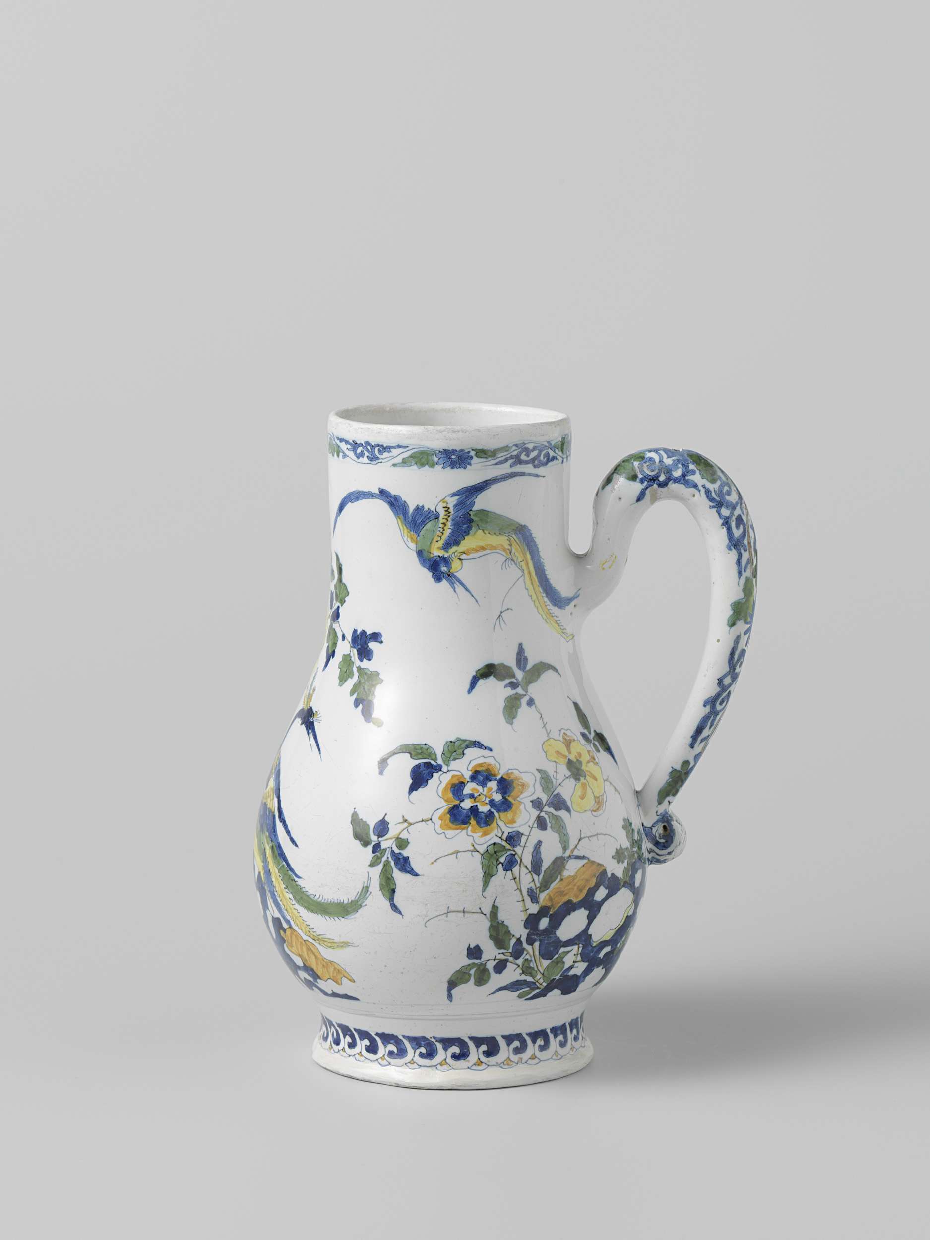 Kan van faience. Veelkleurig beschilderd met bloemtakken en vogels. (Nederlands)