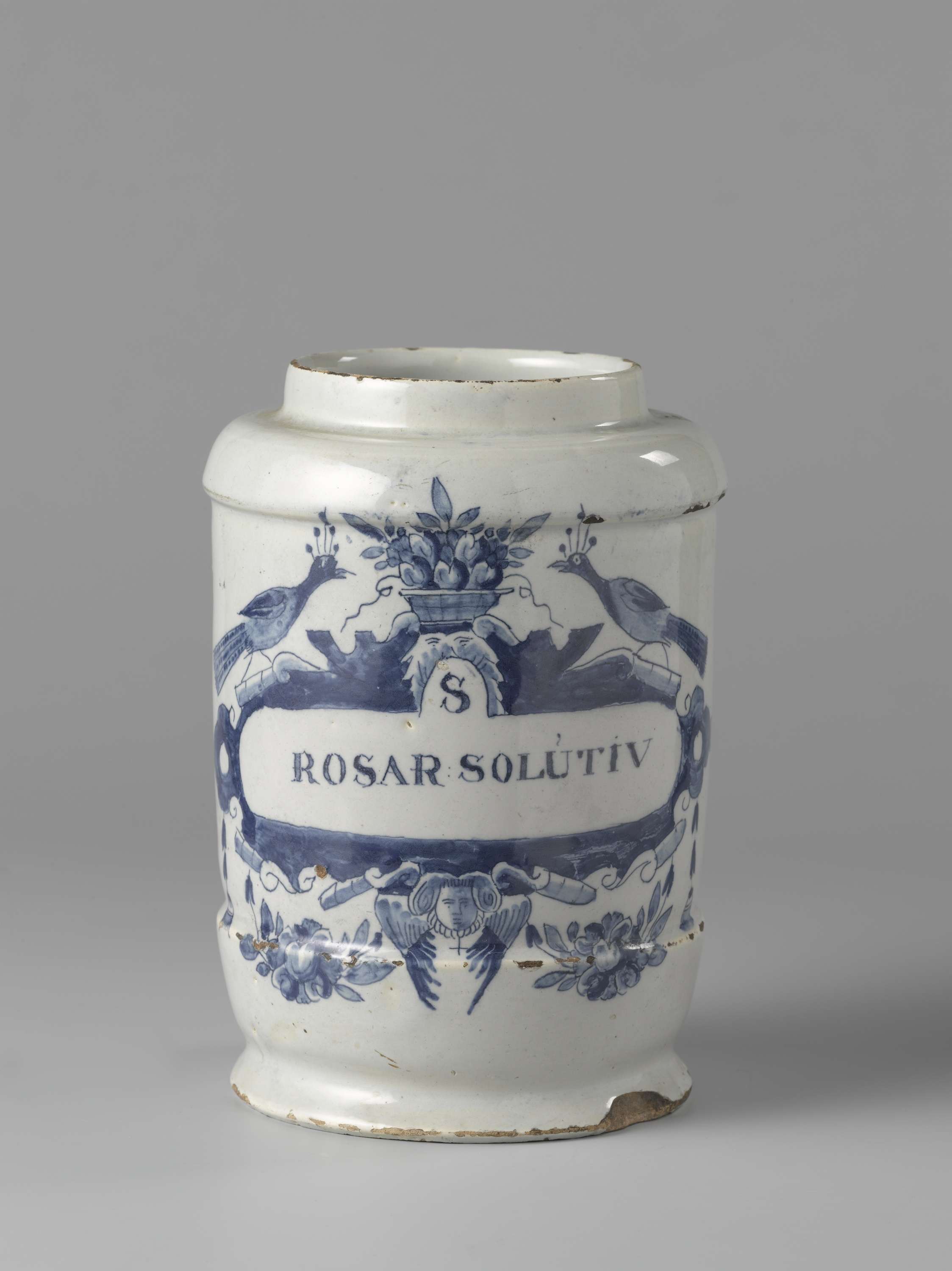 Apothekerspot van faience. Blauw beschilderd met opschrift: S/ ROSAR SOLUTIV. (Nederlands)