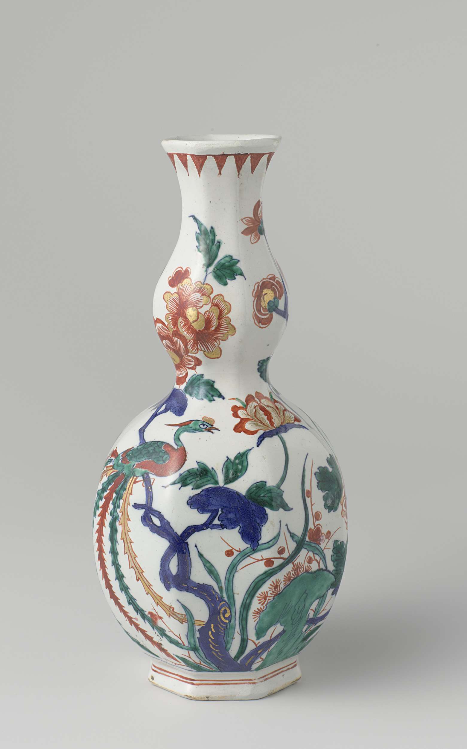 Fles van faience. Veelkleurig beschilderd met bloemtakken en een vogel. (Nederlands)