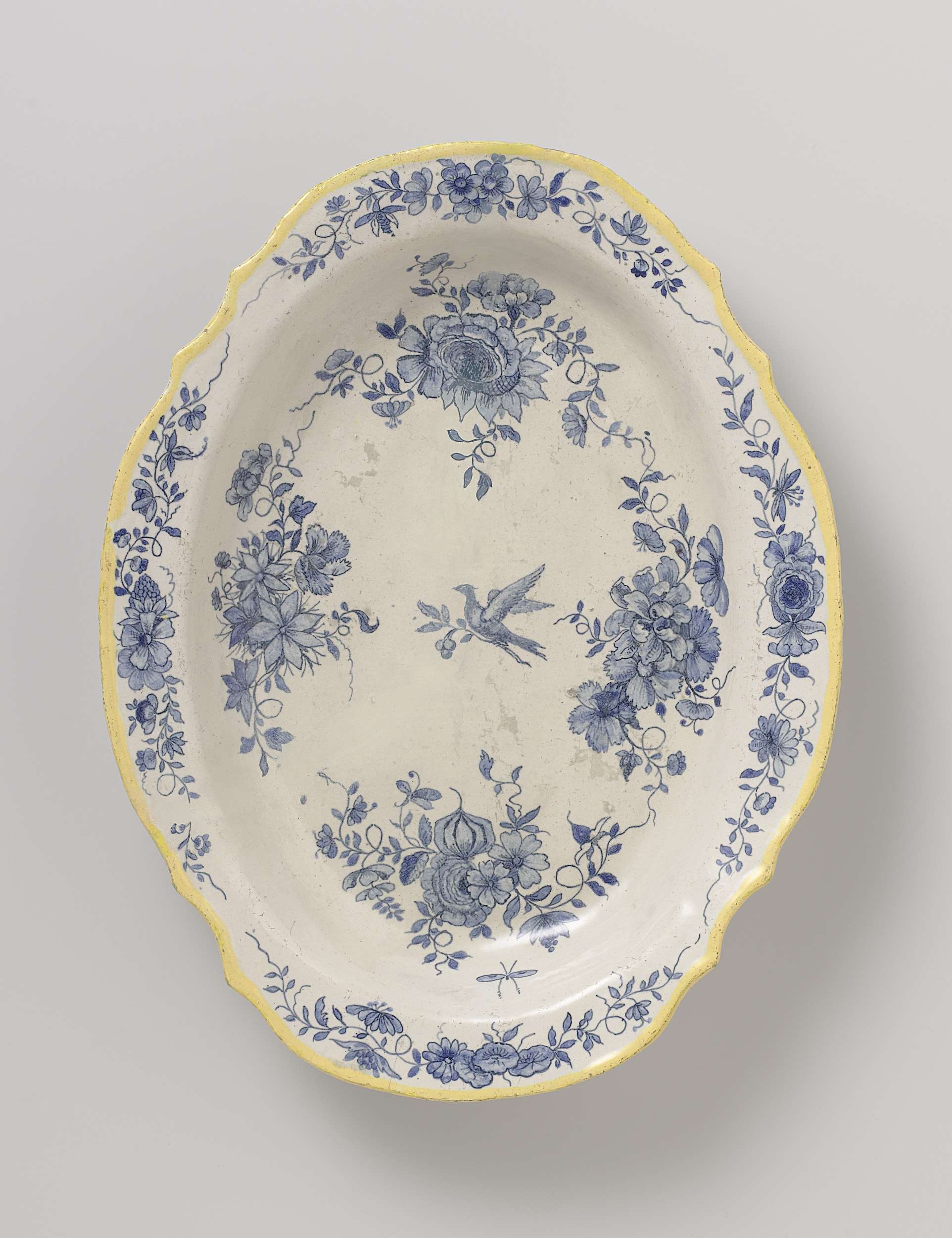 Schaal met een geschulpte, gele rand, beschilderd in blauw met een vogel omgeven door bloemboeketten. Gemerkt AB in onderglazuurblauw. (Nederlands)