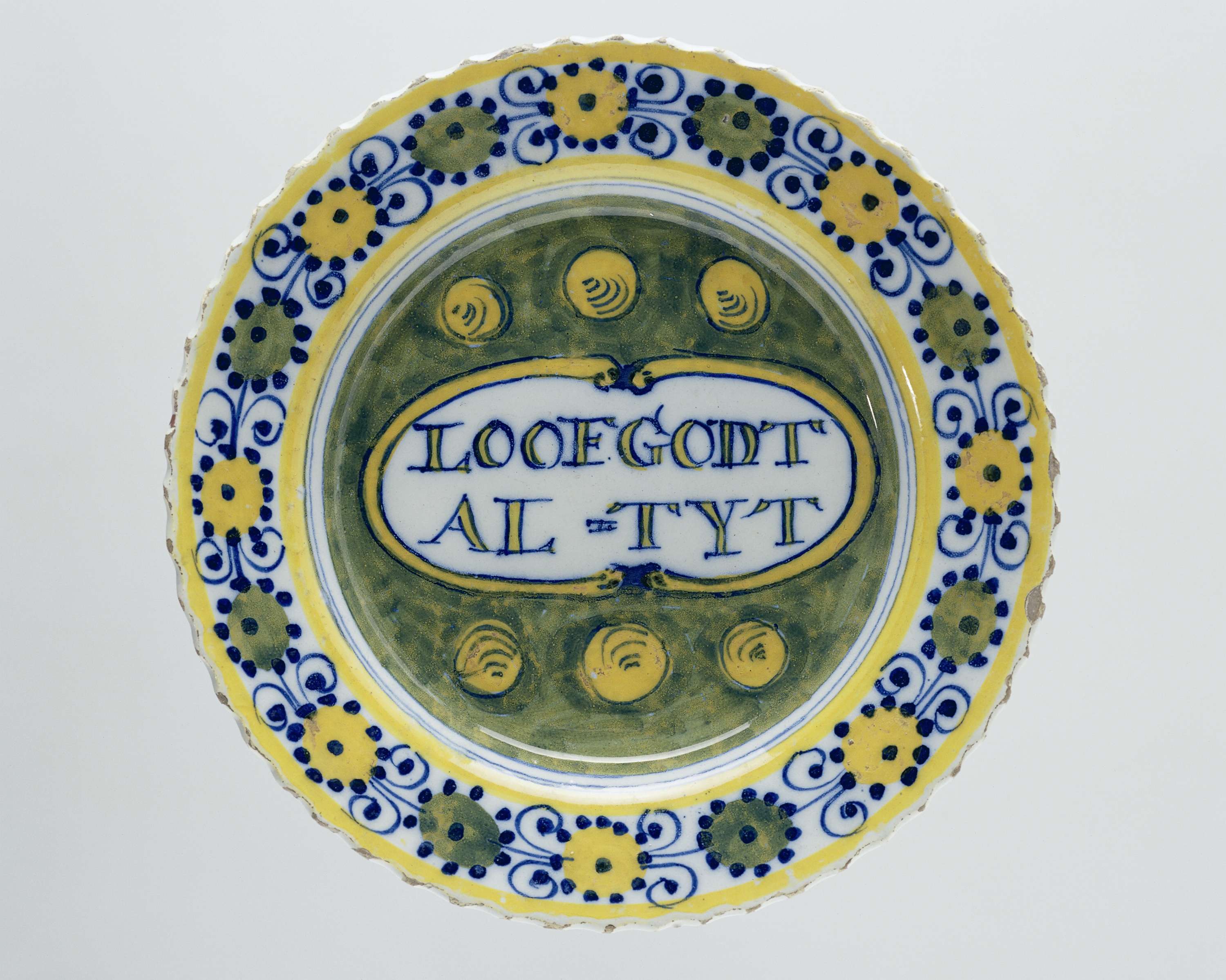 Bord van faience. Veelkleurig beschilderd met in het midden de tekst: LOOF GODT AL-TYT. (Nederlands)