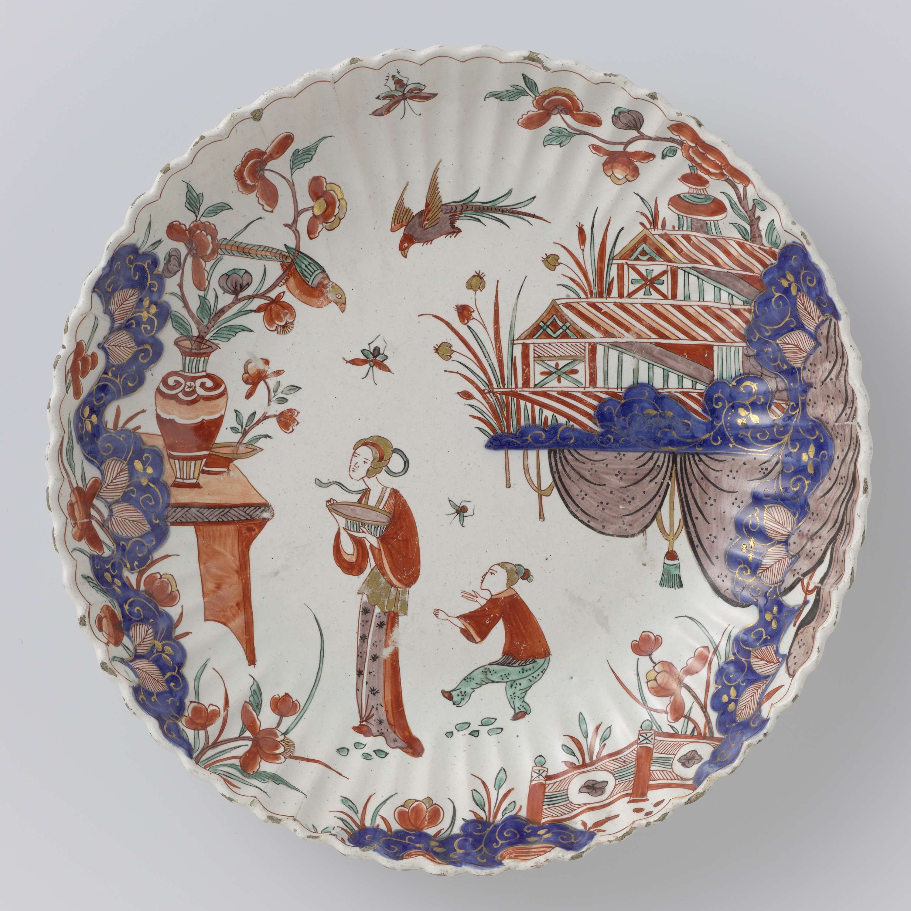 Ronde schaal van veelkleurig beschilderde faïence, met een geribde rand. De schaal is beschilderd met een Japans (?) decor. In een landschap staan twee figuren. Links is een tafel waarop een vaas met bloemen geschilderd en rechts een huis, waaronder een baldakijn. De schaal is gemerkt en hoort bij een identieke schaal. (Nederlands)