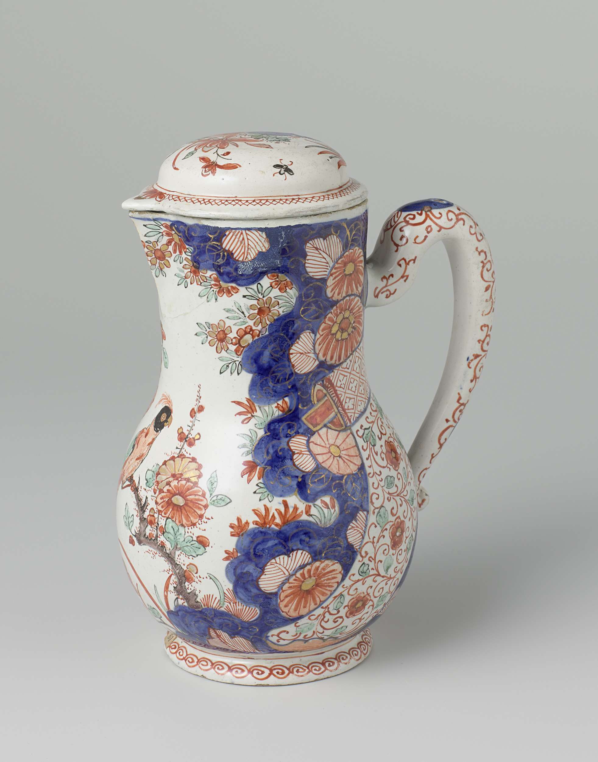 Kan met deksel van faïence. Veelkleurig beschilderd met bloemtakken met vogels. (Nederlands)