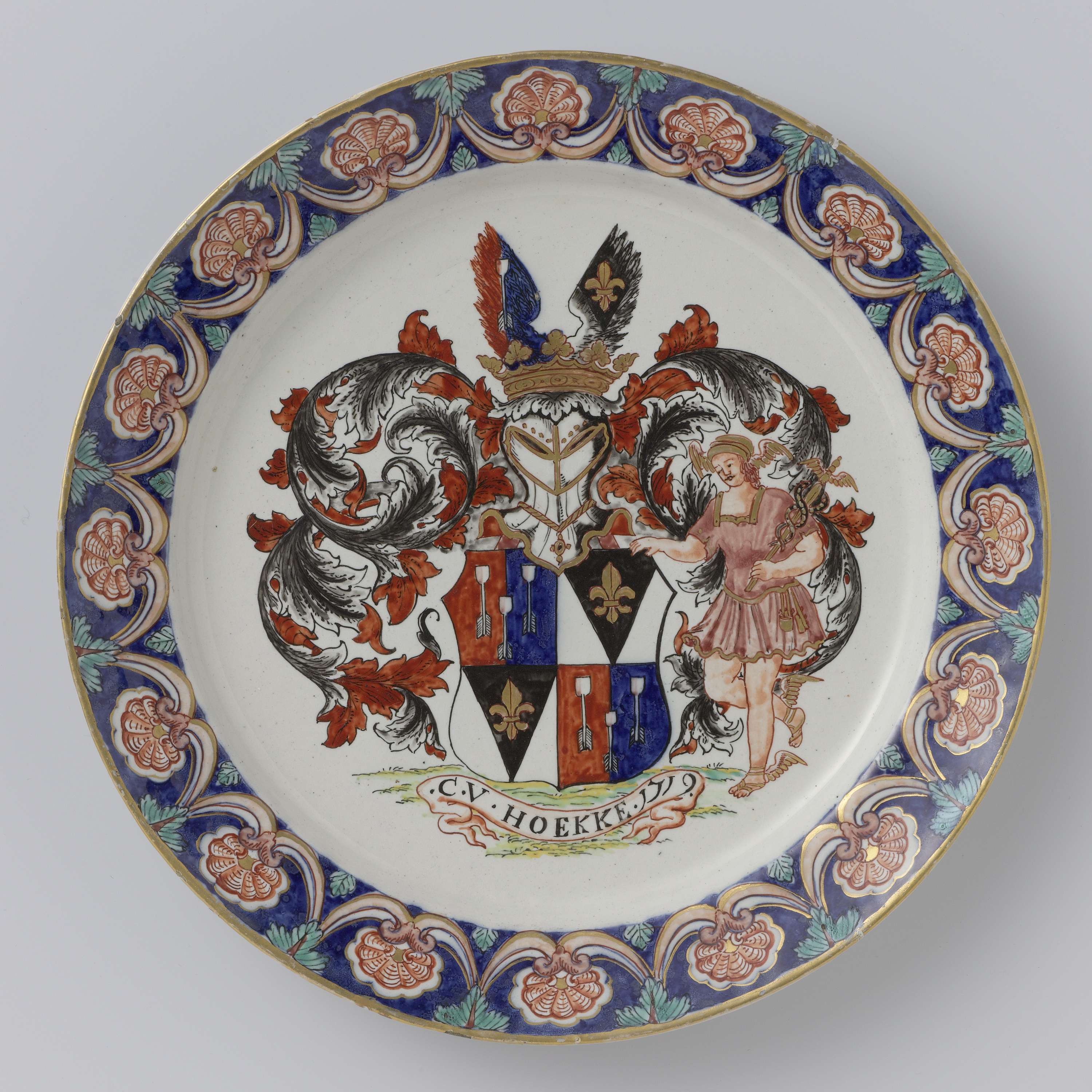 Bord van faïence, veelkleurig beschilderd met het gehelmde familiewapen Cramer van Hoekke. (Nederlands)