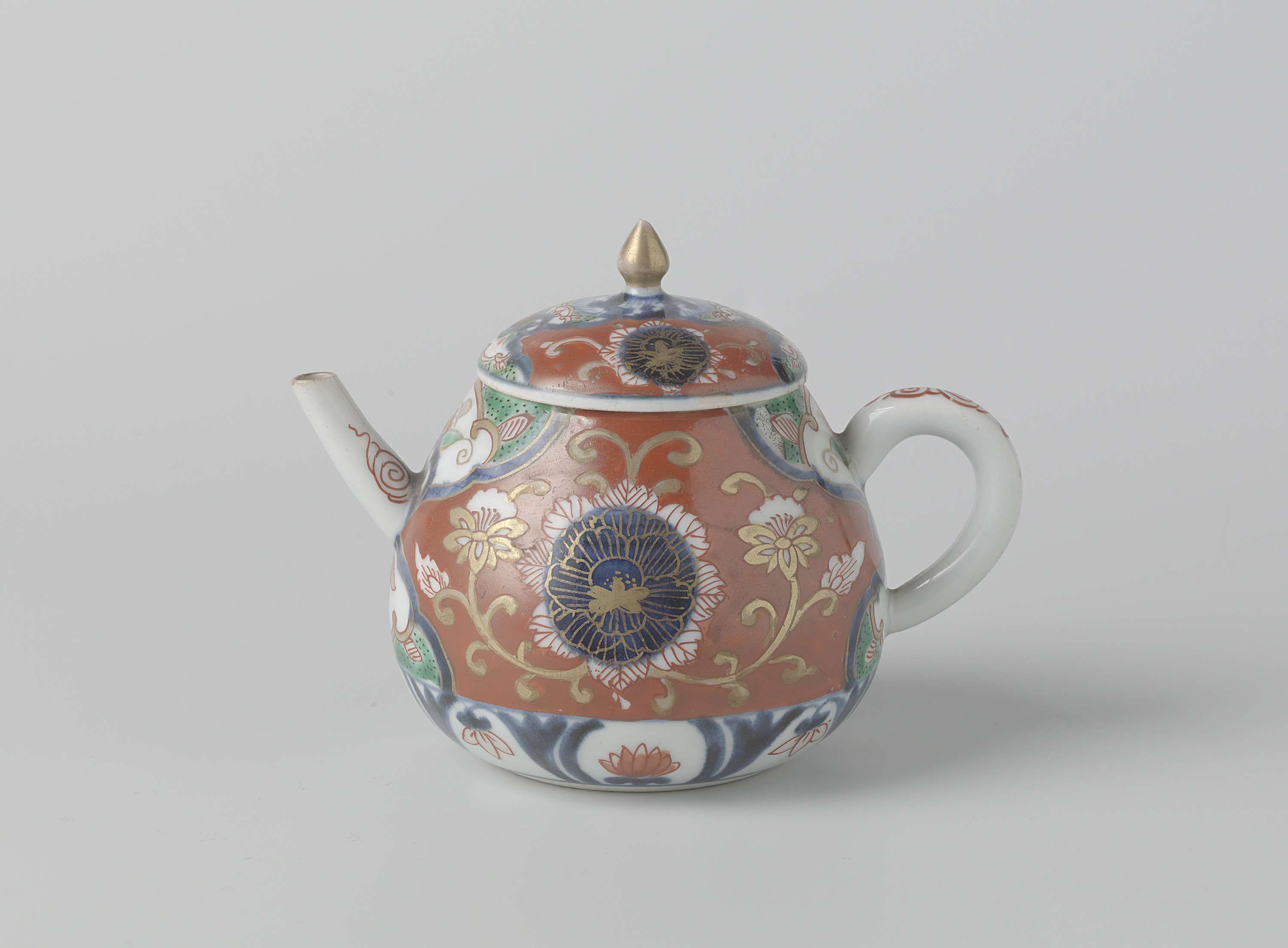 Theepot van porselein met peervormig lichaam, C-vormig oor en licht gebogen tuit, beschilderd in onderglazuur blauw en op het glazuur rood, groen, zwart en goud. Op de wand tweemaal een bloemrozet omgeven door lotusranken. Het oor en de tuit omvat door een cartouche met bladranken en 'kikkerdril'. Rond de voet een band met lotusranken in cartouches. Deksel met dezelfde decoratie. Imari. (Nederlands)