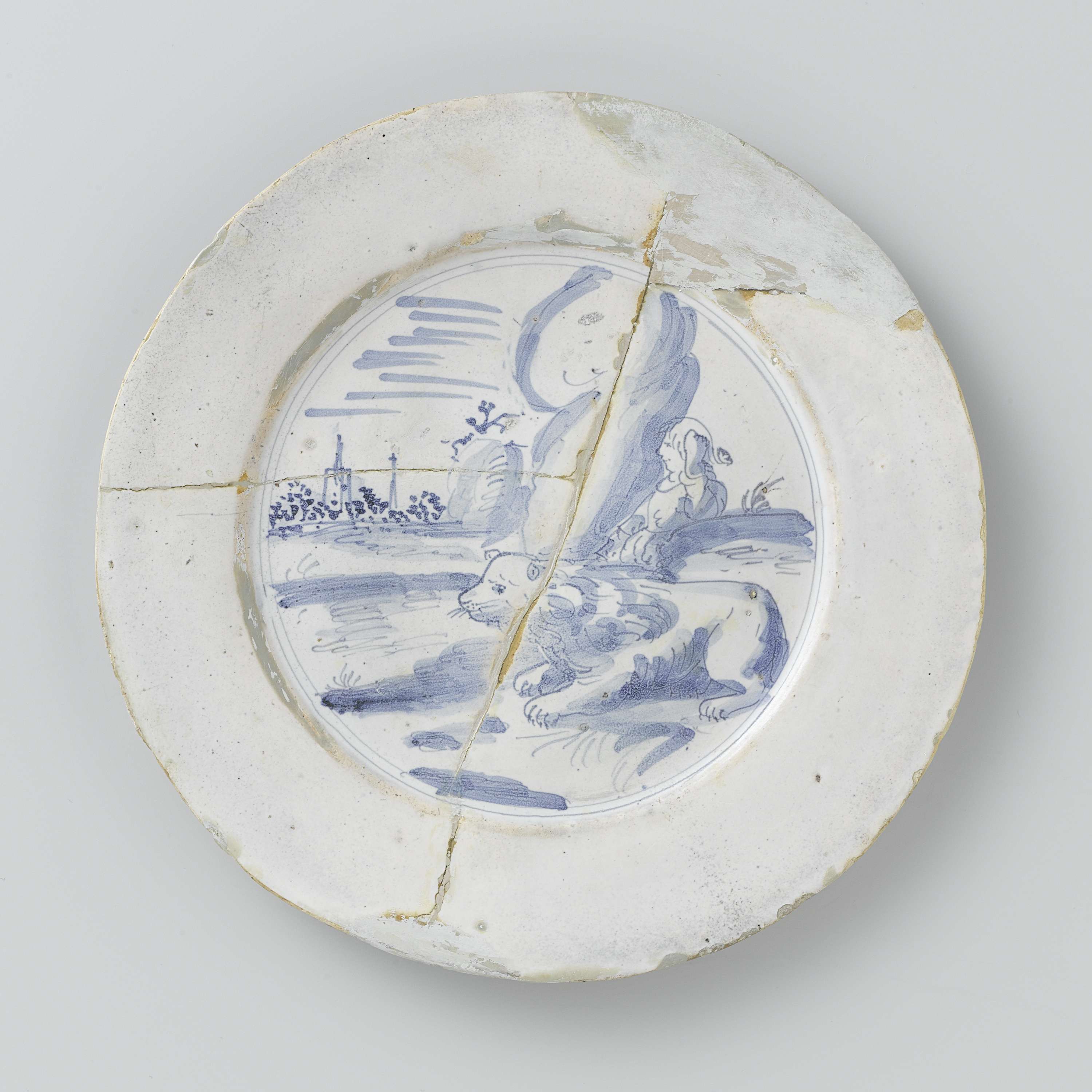 Rond bord van blauw beschilderde faience. Op het plat is een figuur en een leeuw in een landschap (Holland) geschilderd. Het bord is een bodemvondst uit Delft. (Nederlands)