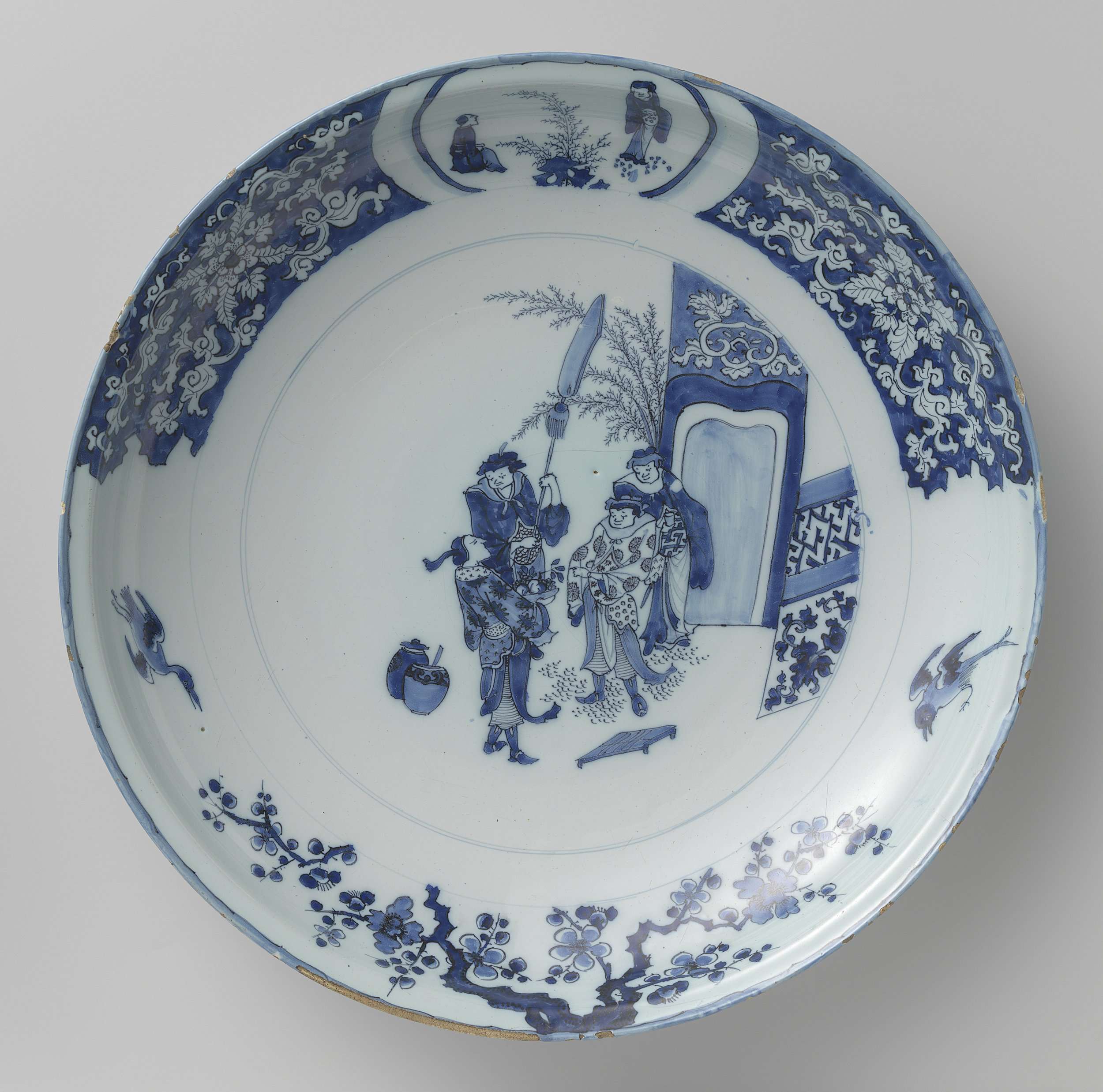 Grote schotel van aardewerk, met zeer smalle iets uitstaande rand. Beschilderd in blauw op wit tinglazuur. Op het plat binnen een dubbele cirkel vier Chinezen voor een poort, geschilderd in navolging van porselein uit de overgangsperiode. De rand is verdeeld in twee helften: de bovendste helft vertoont een veld met twee Chinesen aan weeszijden van een struik; waain bladranken uitgaande van een centraal blad- en bloemmotief zijn uitgespaard; de onderste helft is versierd met twee van één punt naar weerszijden uitgaande bloesemtakken en met twee vliegende vogels. Op de achterkant vakken met steeds één rozet. (Nederlands)