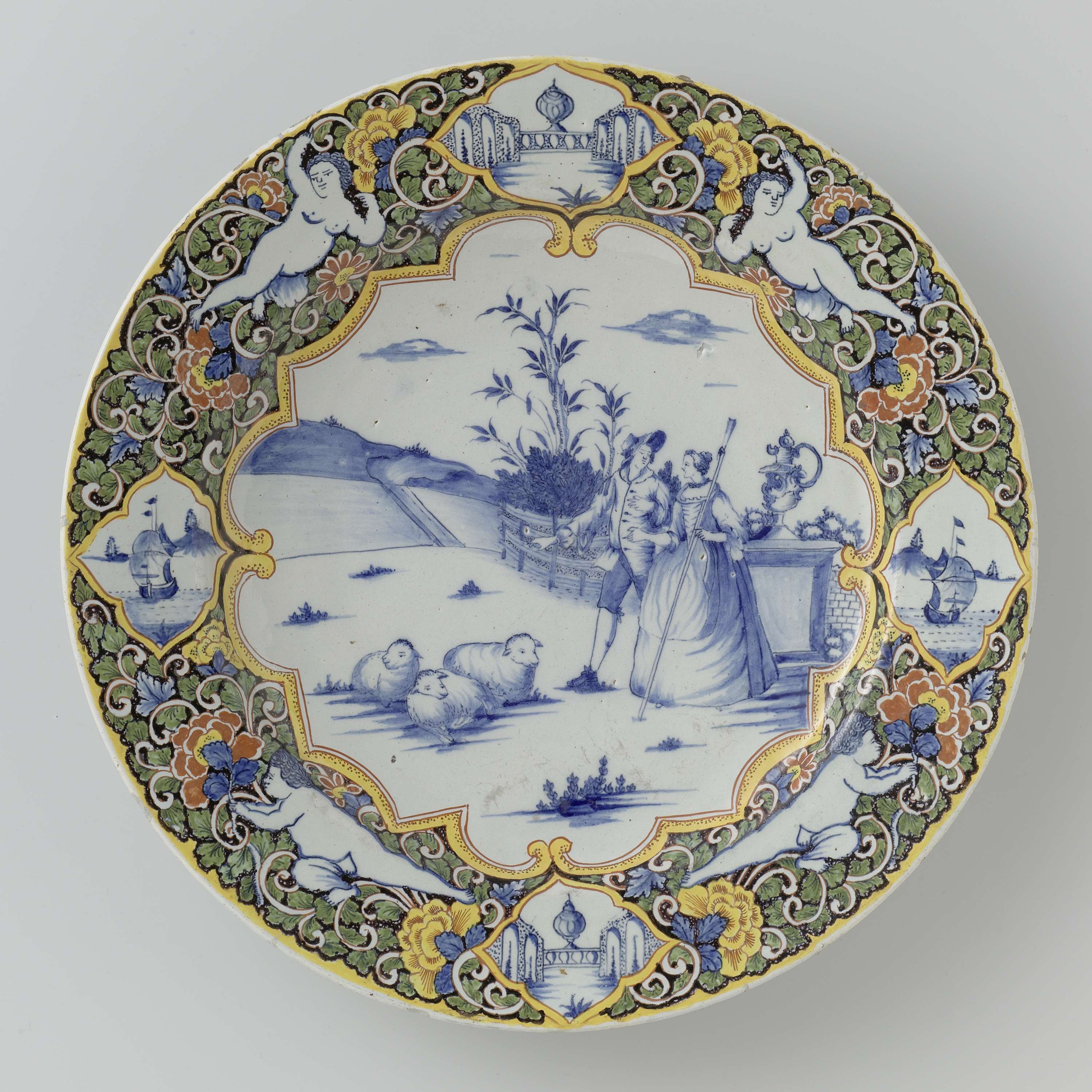 Schotel van faïence, Schotel met op het plat in blauw een herdersscène binnen Louis XIV rand. Veelkleurige randversiering op zwarte grond met putti en vier medaillons. (Nederlands)