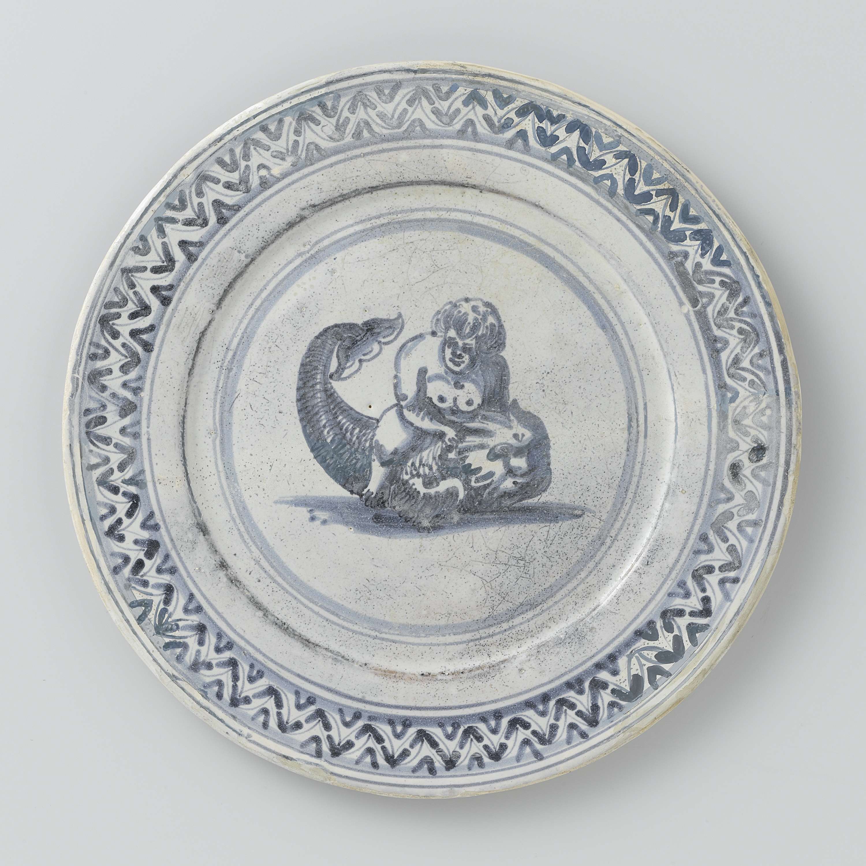 | Nederlands | Bord, beschilderd met naakte figuur op dolfijn. |