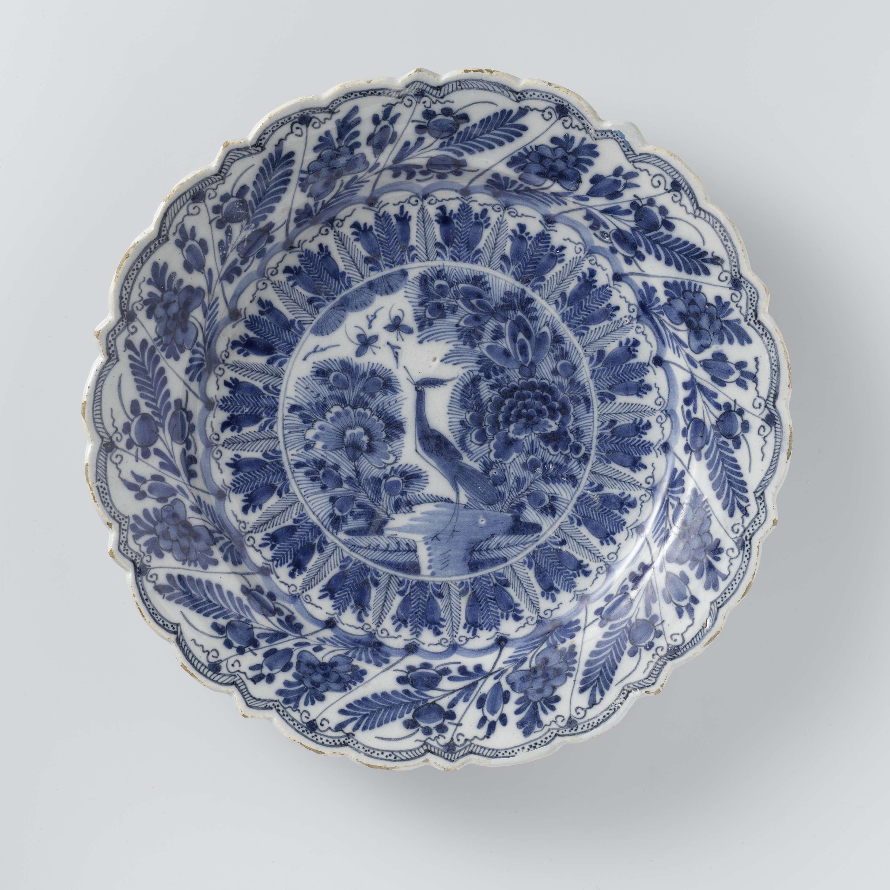 Ronde schotel van blauw geschilderde faience, met een geschulpte rand en versierd met het reigerpatroon. De schotel is gemerkt: LP kan Delft Fabr. Bij de schotel horen zes identieke schotels met invnrs. BK-NM-13284-a, BK-NM-13284-c, BK-NM-13284-d, BK-NM-13284-e, BK-NM-13284-f en BK-NM-13284-g. (Nederlands)