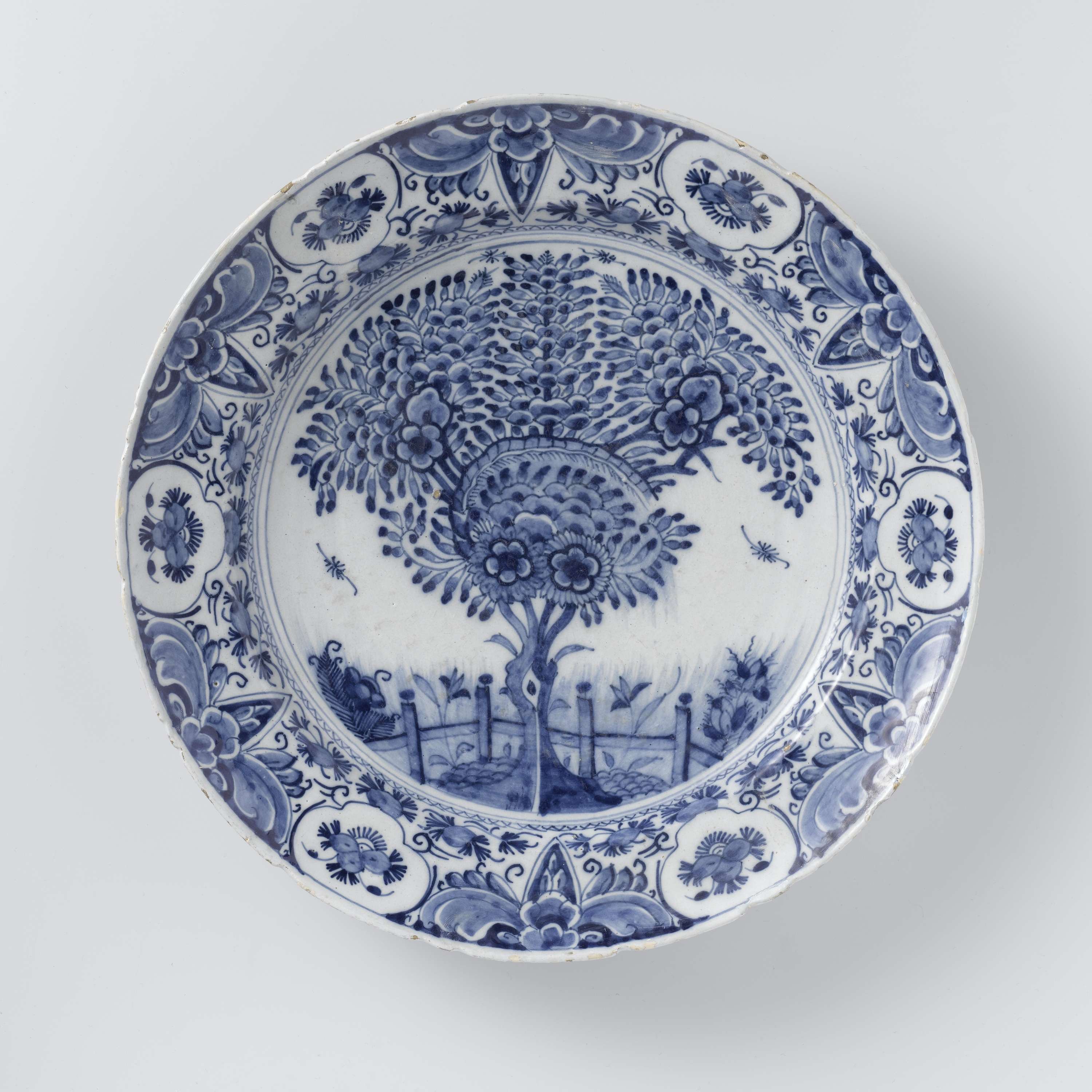 Ronde schotel van blauw beschilderde faience. Op het plat is een boom (theeboom ?) voor een hek geschilderd en op de rand bloemmotieven. De schotel is gemerkt met het merk van de plateelbakkerij De Grieksche A. Bij de schotel horen vier identieke schotels met invnrs. BK-NM-13291-a, BK-NM-13291-b, BK-NM-13291-d en BK-NM-13291-e. (Nederlands)