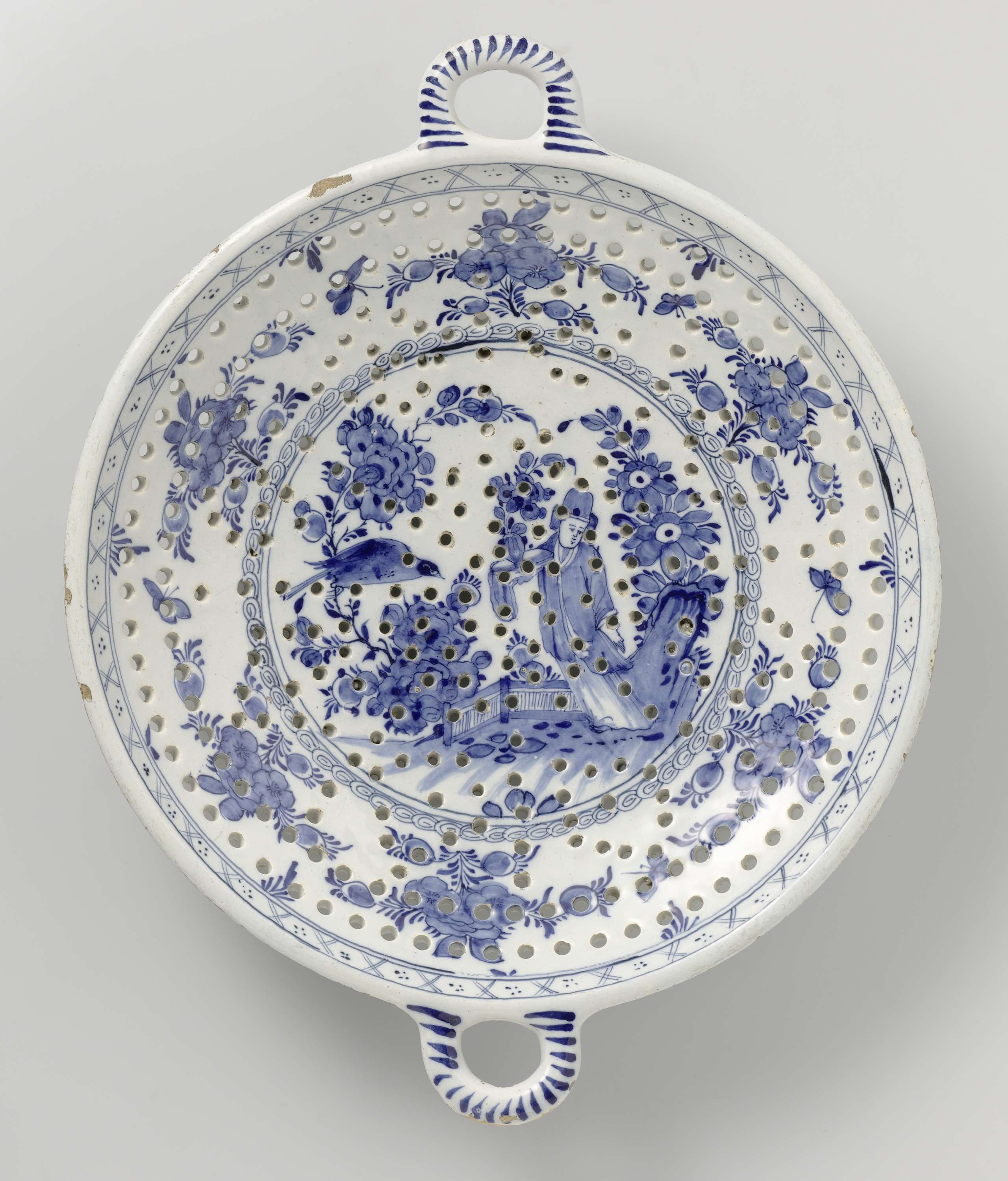 Visvergiet van faience. Blauw beschilderd met een chinoiserie decoratie. (Nederlands)
