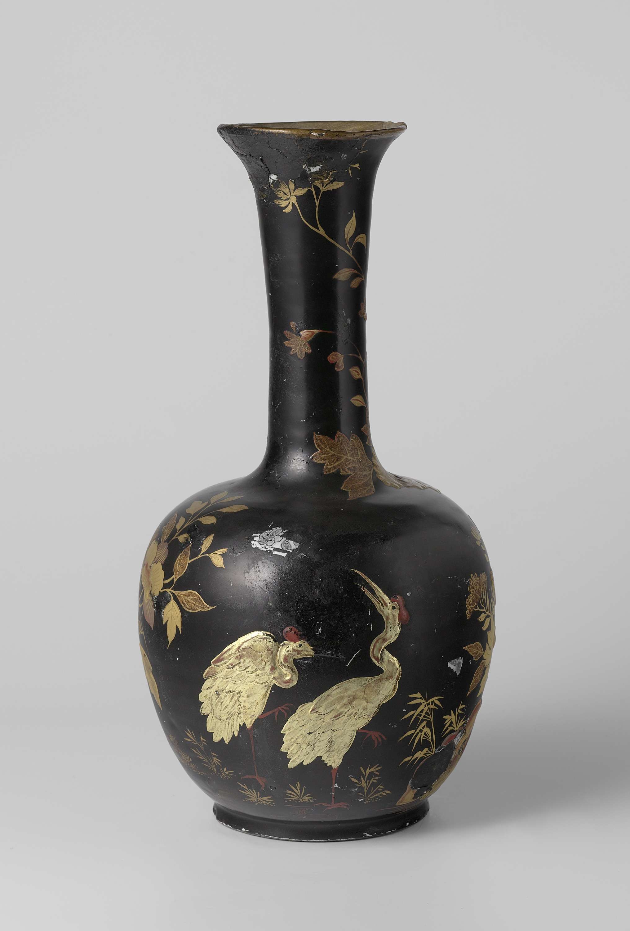 Vaas van faience. Geheel bedekt met verlakking in zwart met bloemen in goud en rood. (Nederlands)