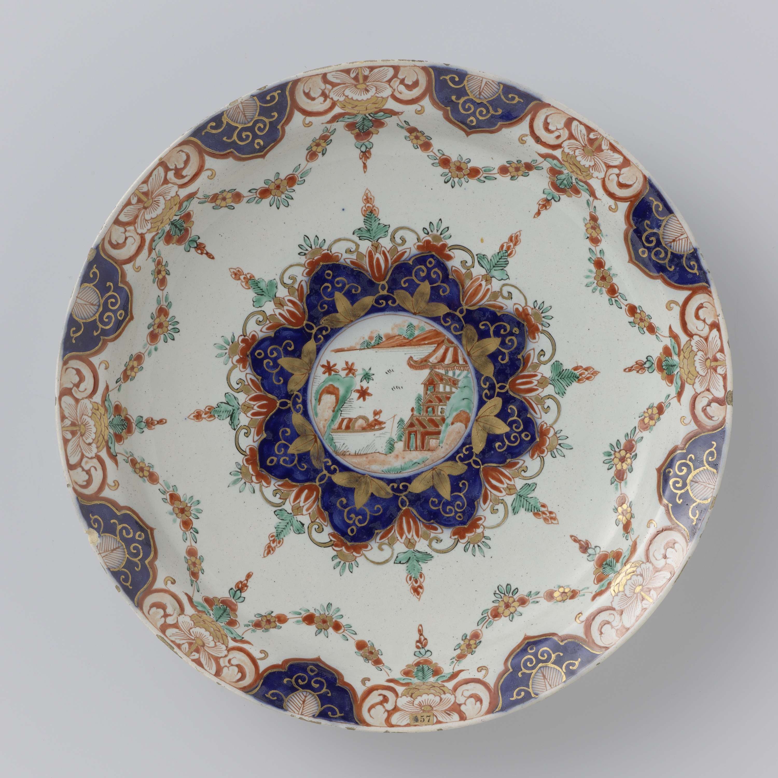 Bord van faïence. Veelkleurig beschilderd met een Chinees waterlandschap en lambrequins, in imari kleuren. (Nederlands)