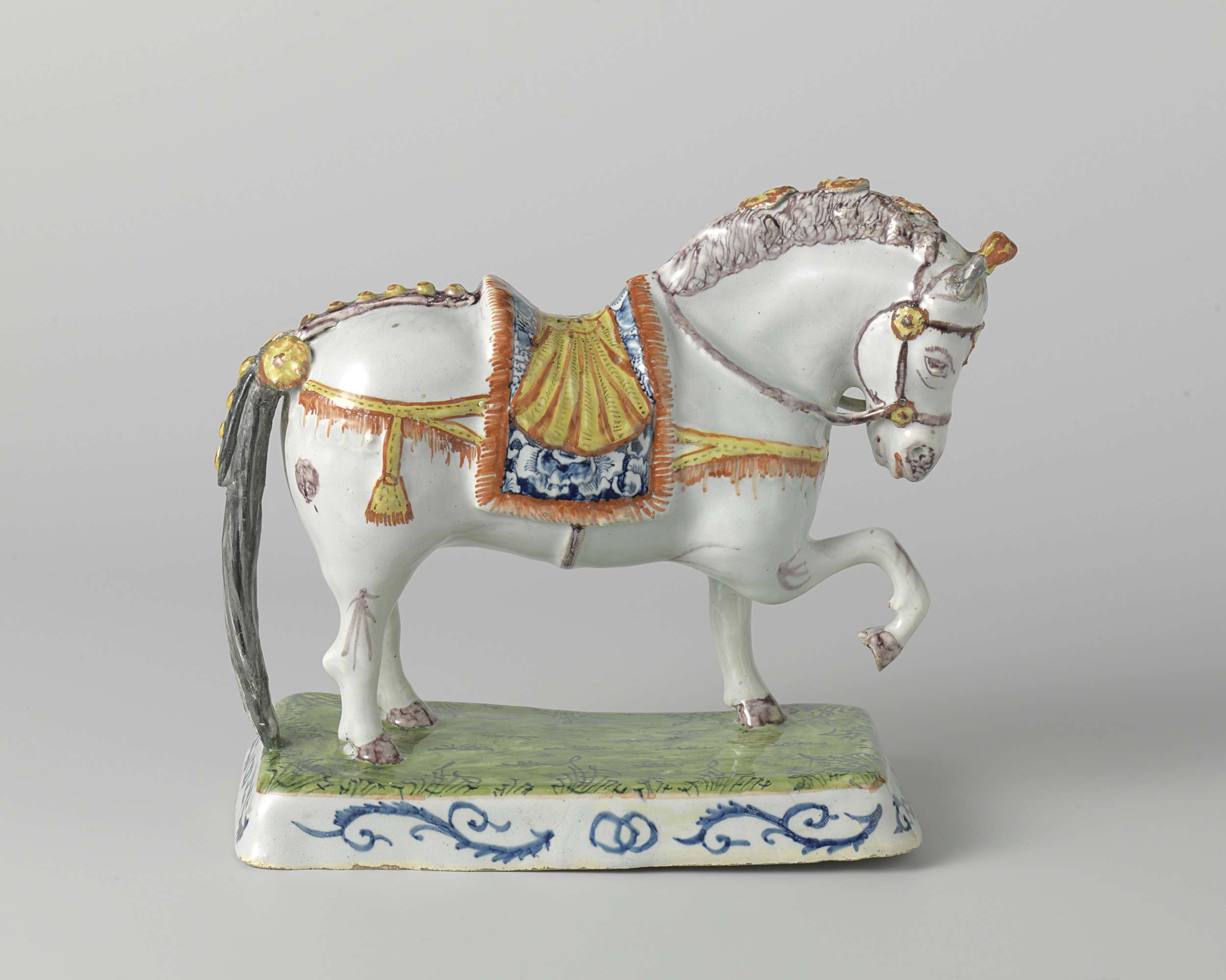 Dierenfiguur van faience, voorstellende een paard. Veelkleurig beschilderd. (Nederlands)