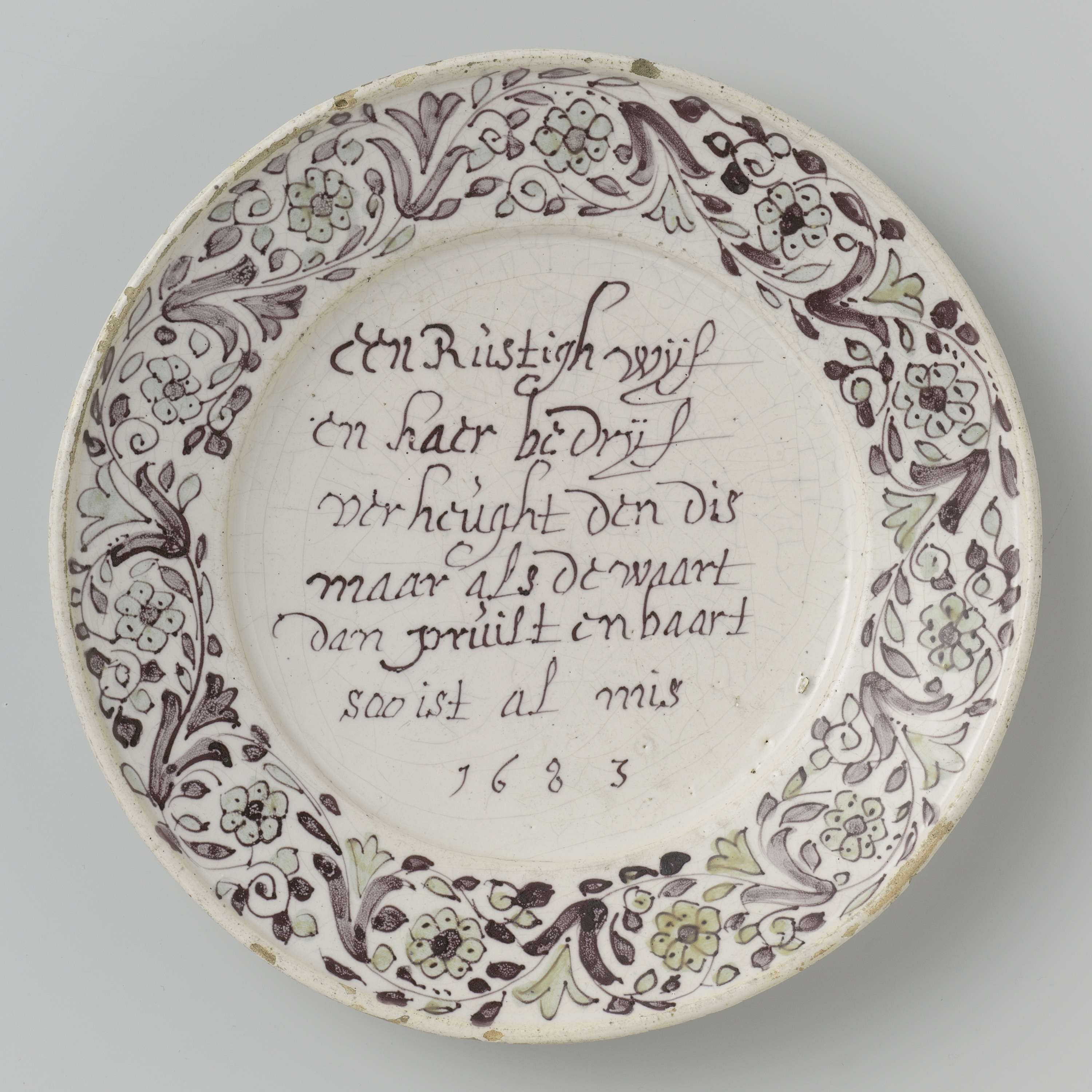 Bord van faience. Veelkleurig beschilderd met een tekst. Een Rustigh wijf/ en haer bedrief/ verheught den dis/ maar als de waart // dan pruilt en baart/ soo is al mis/ 1683. (Nederlands)