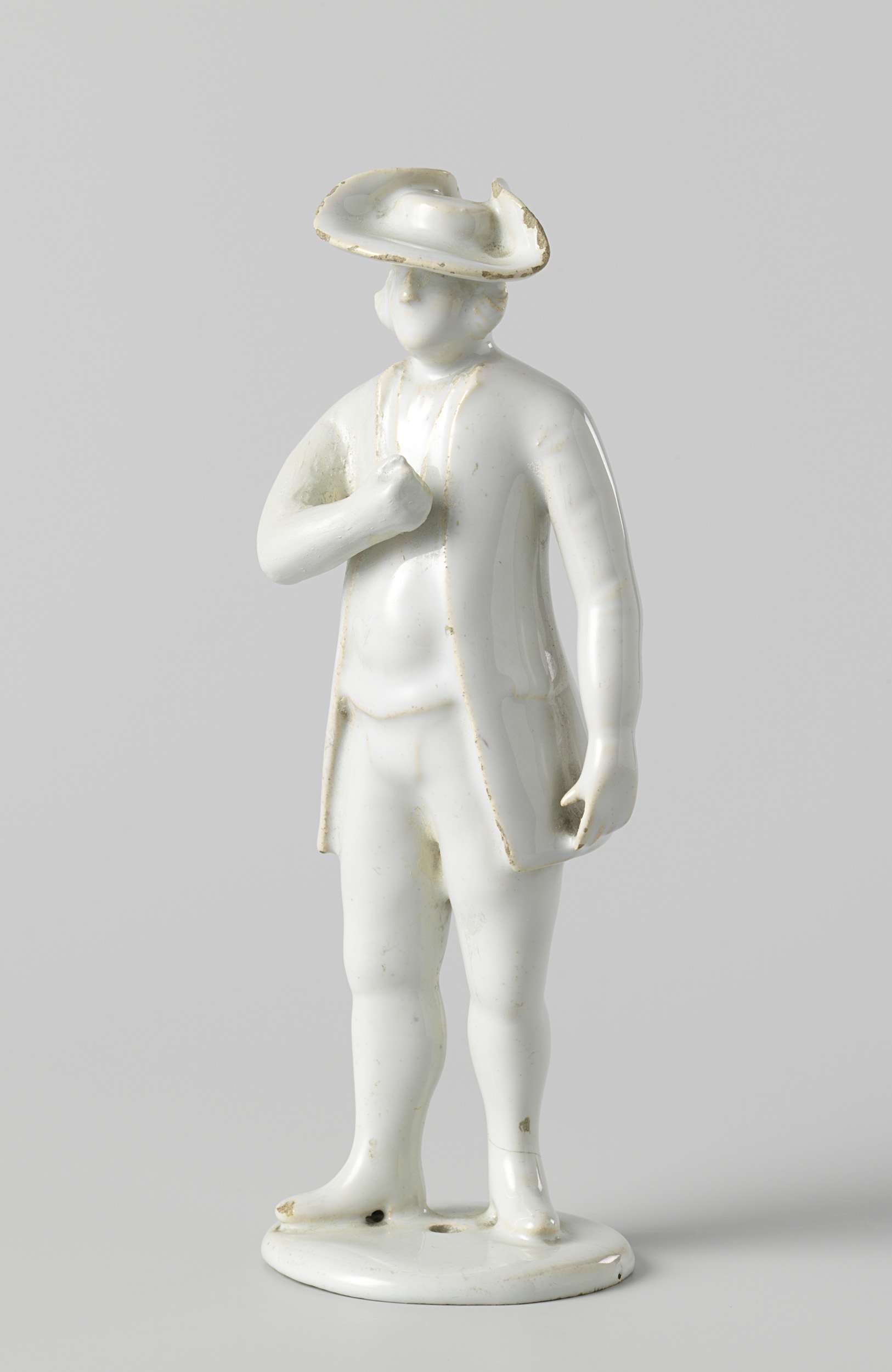 Beeld van ongedecoreerde faience. Op een rond voetstuk staat een man. De man draagt een steek op zijn hoofd en heeft zijn rechterarm op zijn borst, zijn linkerarm hangt naast zijn lichaam. (Nederlands)