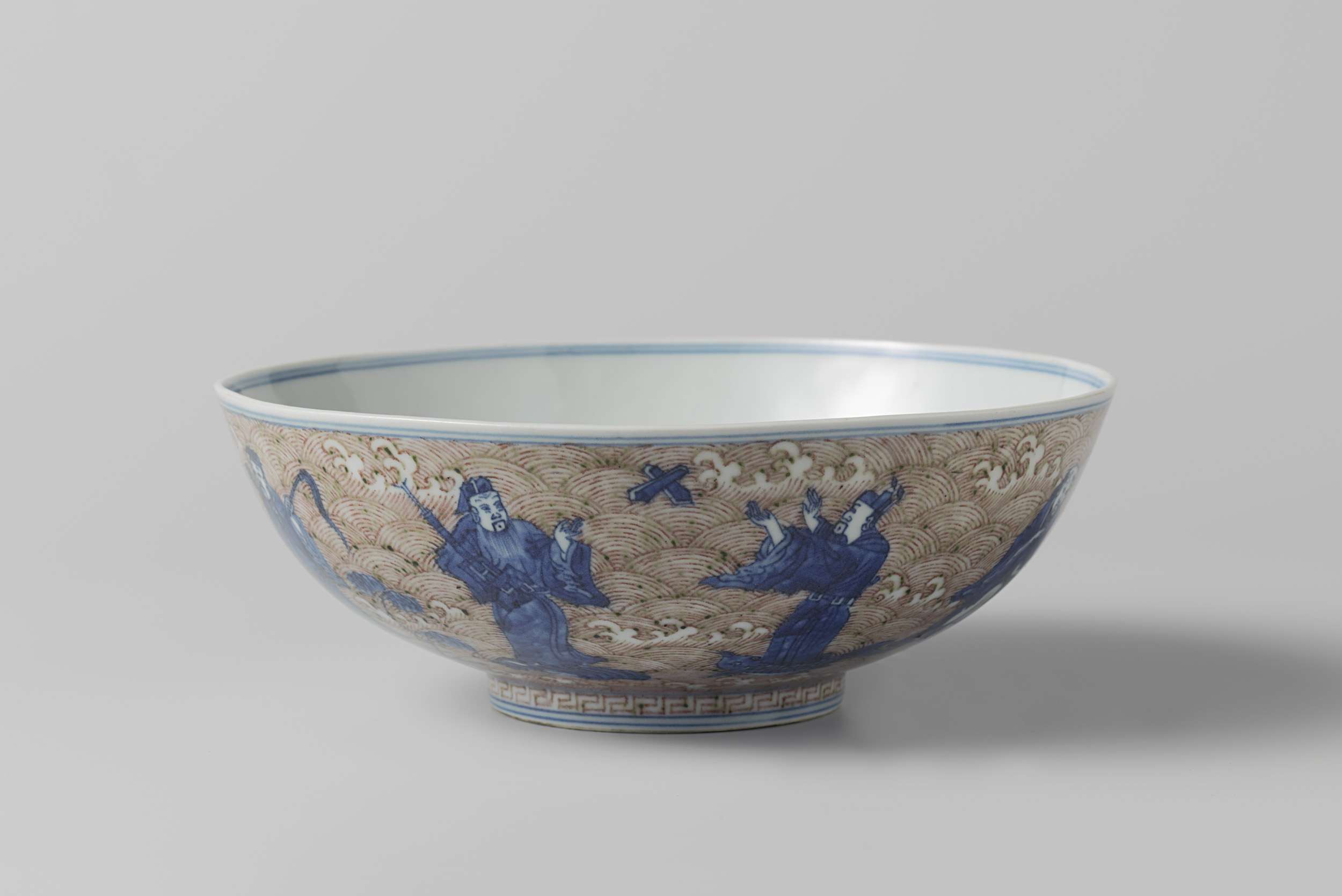 Kom van porselein met uitlopende wand, beschilderd in onderglazuur blauw en rood. Op de buitenzijde de Acht Onsterfelijken staande op zeedieren, tegen een achtergrond van schuimende golven; op de bodem Shoulao met een hert met een paddenstoel in zijn bek tegen een achtergrond van schuimende golven en wolken; rond de voetring een decoratieve rand met meander-motief. Op de onderzijde het zes-karaktermerk Chenghua in een dubbele cirkel en een oud label met daarop 'Marked Ching-Hua periode 1465-1488 1888 A. Trapnell'. Onderglazuur blauw met koperrood. (Nederlands)