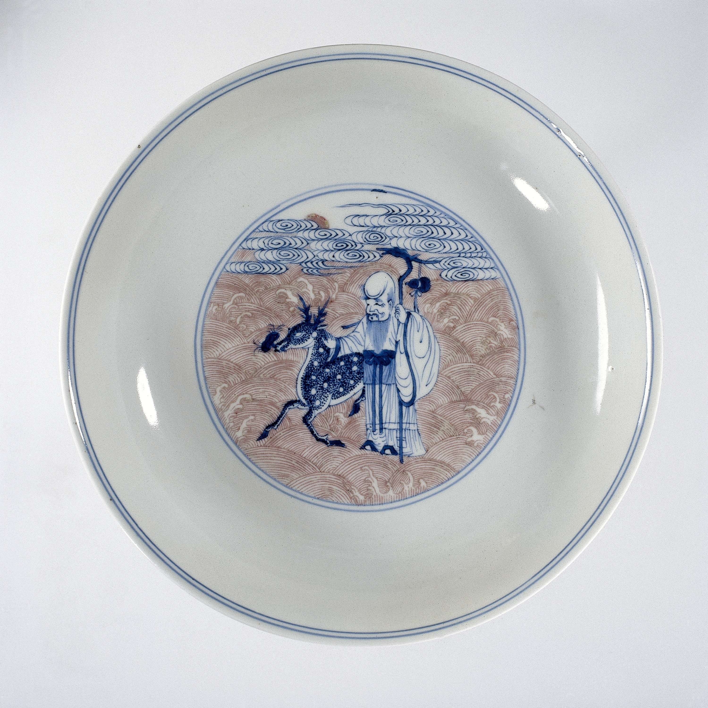 Schaal van porselein met ronde wand, beschilderd in onderglazuur blauw en rood. Op het plat Shoulao met staf en naast he...k met 'Hall for cultivating harmony'. Onderglazuur blauw en rood.||China||http://hdl.handle.net/10934/RM0001.COLLECT.313776 |