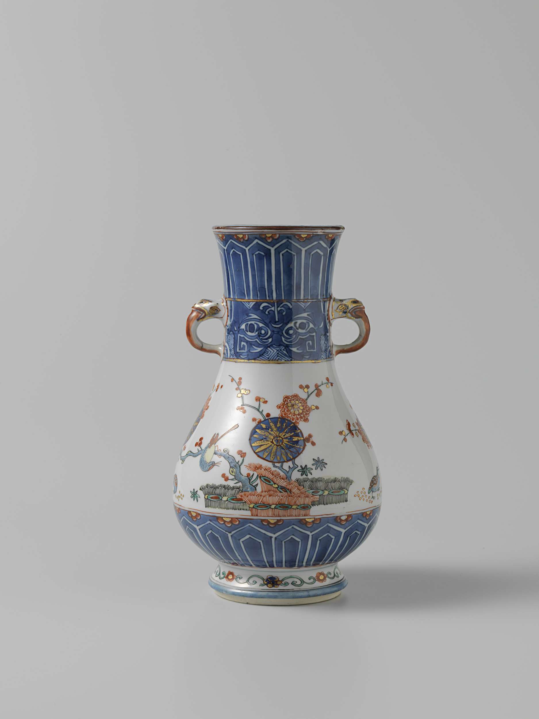 Peervormige vaas van porselein met een wijde, iets spreidende nek en twee gemodelleerde oren in de vorm van dierenkoppen. Beschilderd in onderglazuur blauw en op het glazuur blauw, rood, groen, geel, zwart en goud. In China op de buik in onderglazuur blauw gedecoreerd met vier yin yang-symbolen; daaronder een blauwe band met uitgespaarde bladmotieven en halve bloemen. De hals met dezelfde band en een band met 'taotie' maskers op servetwerk. In Europa op de buik gedecoreerd in emailkleuren met vogels op prunustakken achter bijeengebonden heggen; hiertussen kwartels op de grond. De yin yang-symbolen zijn overschilderd met een bloemroset als onderdeel van de prunustak. Op de voet een band met bloemranken. Gemerkt op de onderzijde met vier imitatie Chinese karakter in rood email. In Europa gedecoreerd met emailkleuren. (Nederlands)