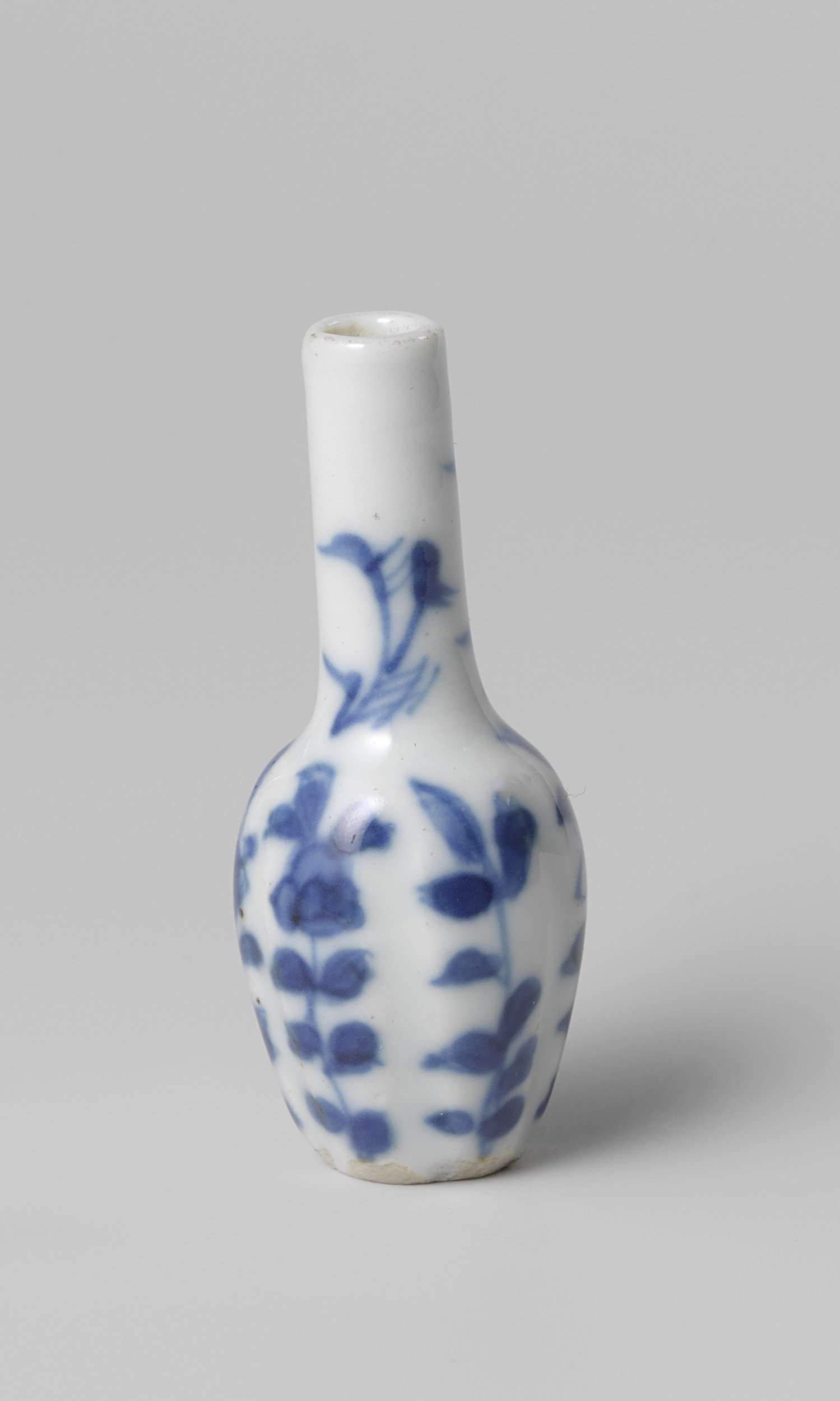 Miniatuur flesvormige vaas van porselein met een zeslobbig lichaam, beschilderd in onderglazuur blauw. Op de buik en nek bloeiende planten. Blauw-wit.||China||http://hdl.handle.net/10934/RM0001.COLLECT.509580