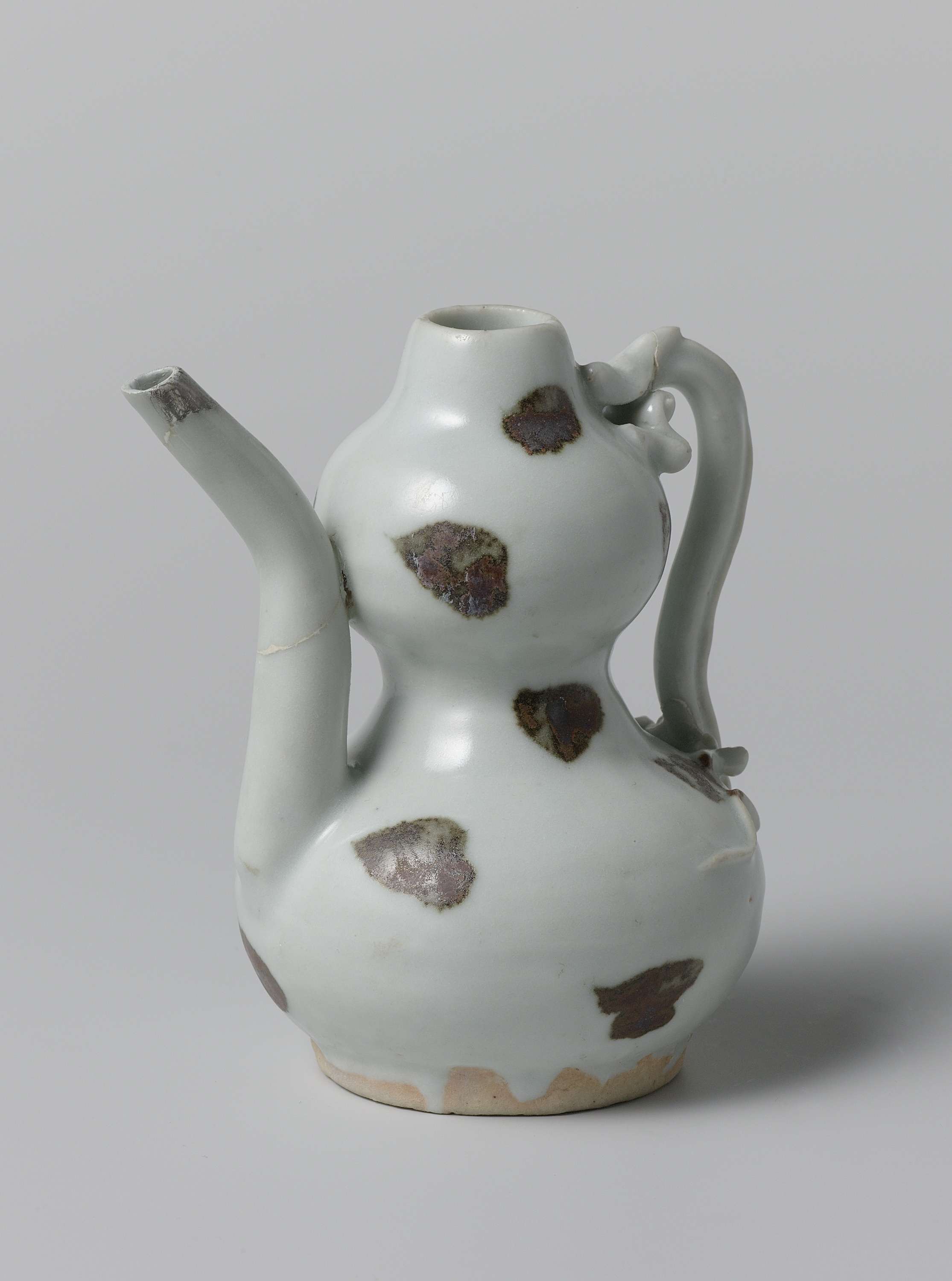 Kalebasvormige kan van steengoed, bedekt met een licht blauwwit glazuur en ijzerrood. Het oor is gemodelleerd in de vorm...g) en een gebogen tuit. Oor en tuit gebroken geweest. Qingbai[?].||China||http://hdl.handle.net/10934/RM0001.COLLECT.336490