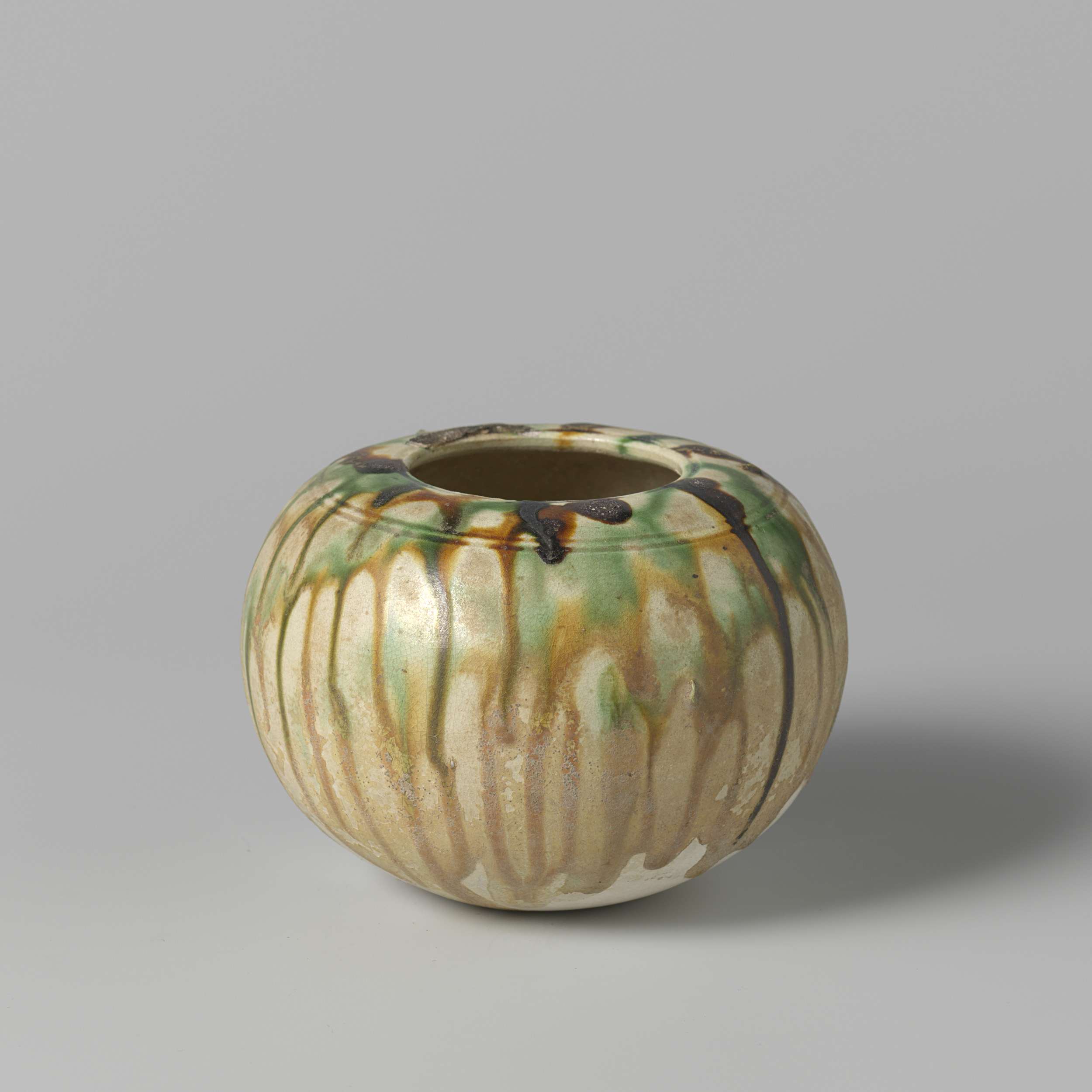 Dekselpot van aardewerk met een bolvormig lichaam, bedekt met een groen, bruin en crèmekleurig glazuur. De deksel met bruine en groene vlekken. Sancai, Tang. (Nederlands) | |||||||||||||||