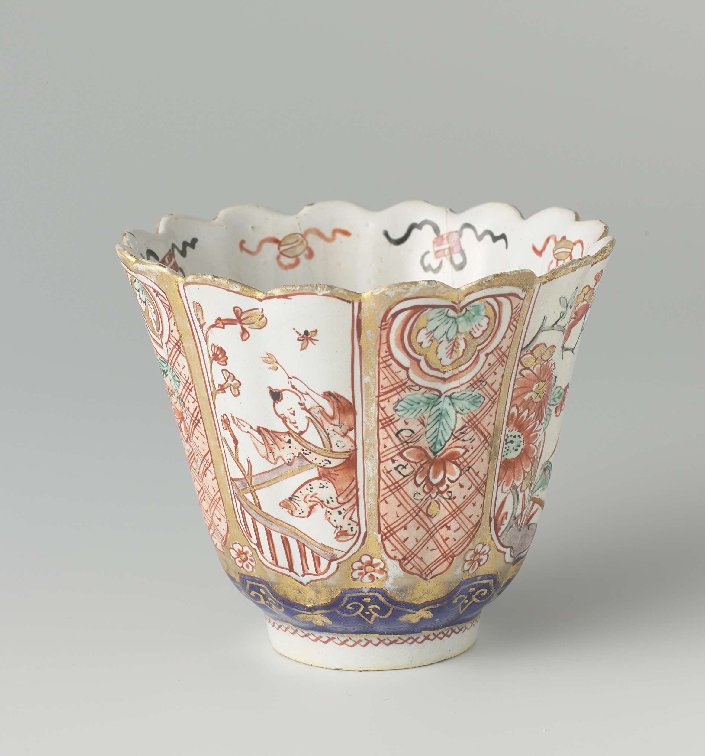 Geribde kop van faience met geschulpte rand. Veelkleurig beschilderd. (Nederlands)