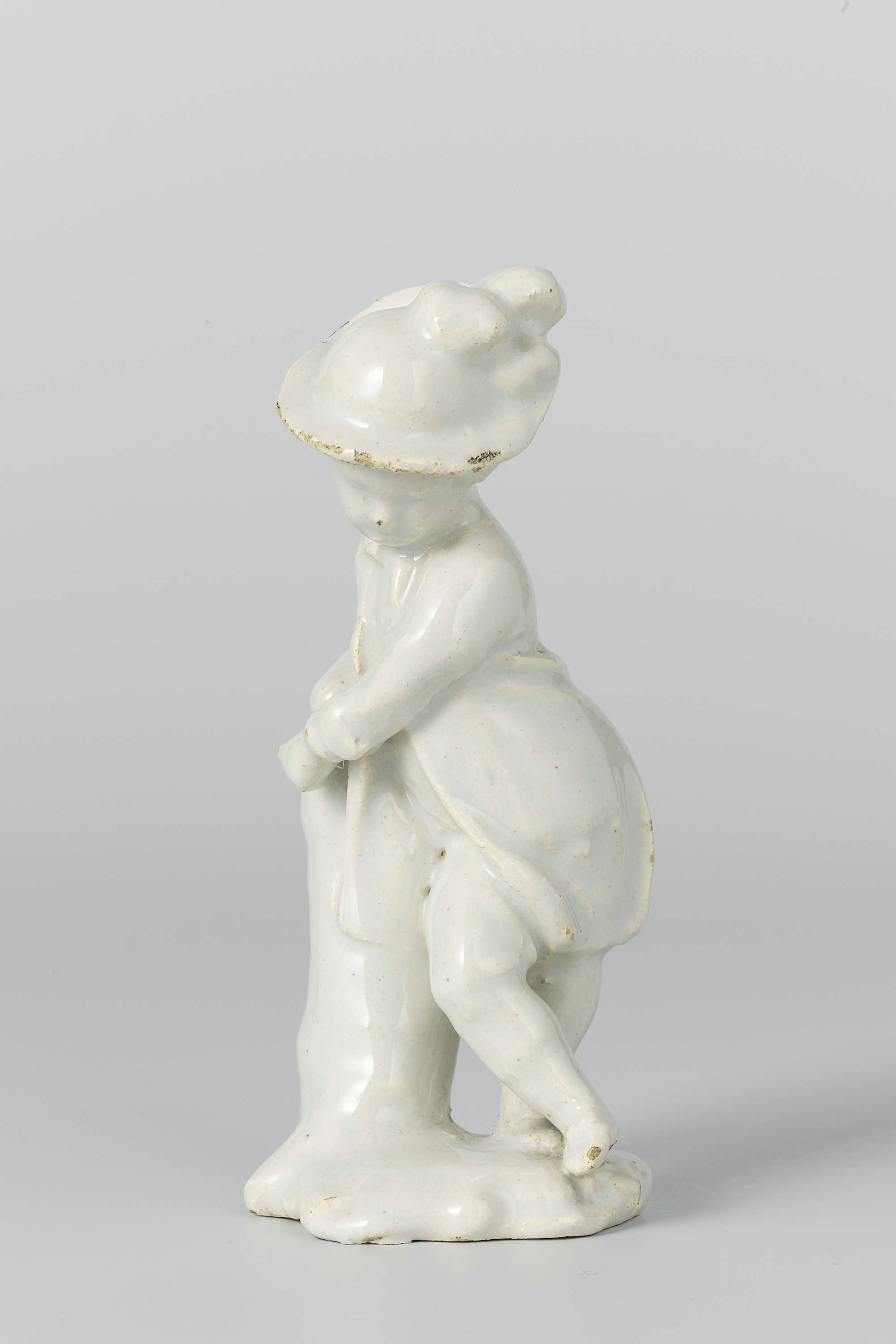 Kinderfiguur van faience, voorstellende een jongen geleund tegen een boomstronk. Wit geglazuurd. (Nederlands)