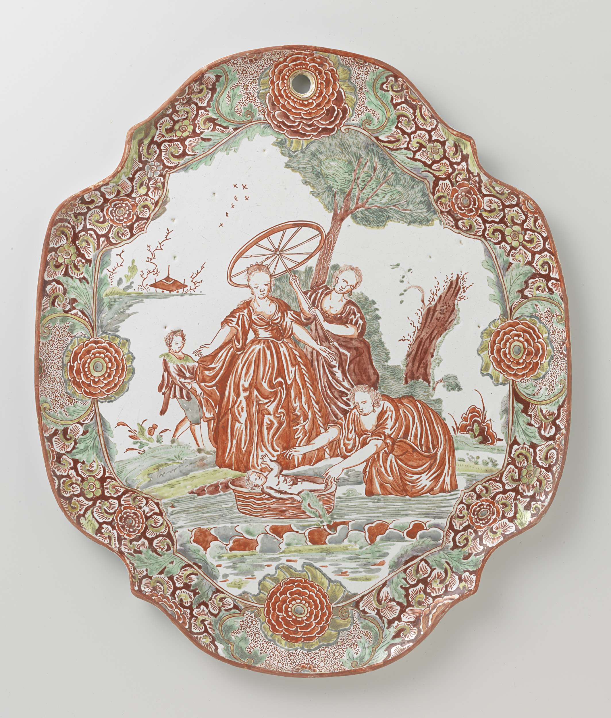 Plaque van faience. Veelkleurig beschilderd met de voorstelling van de dochter van de farao die Mozes in de biezen mand vindt. (Nederlands)