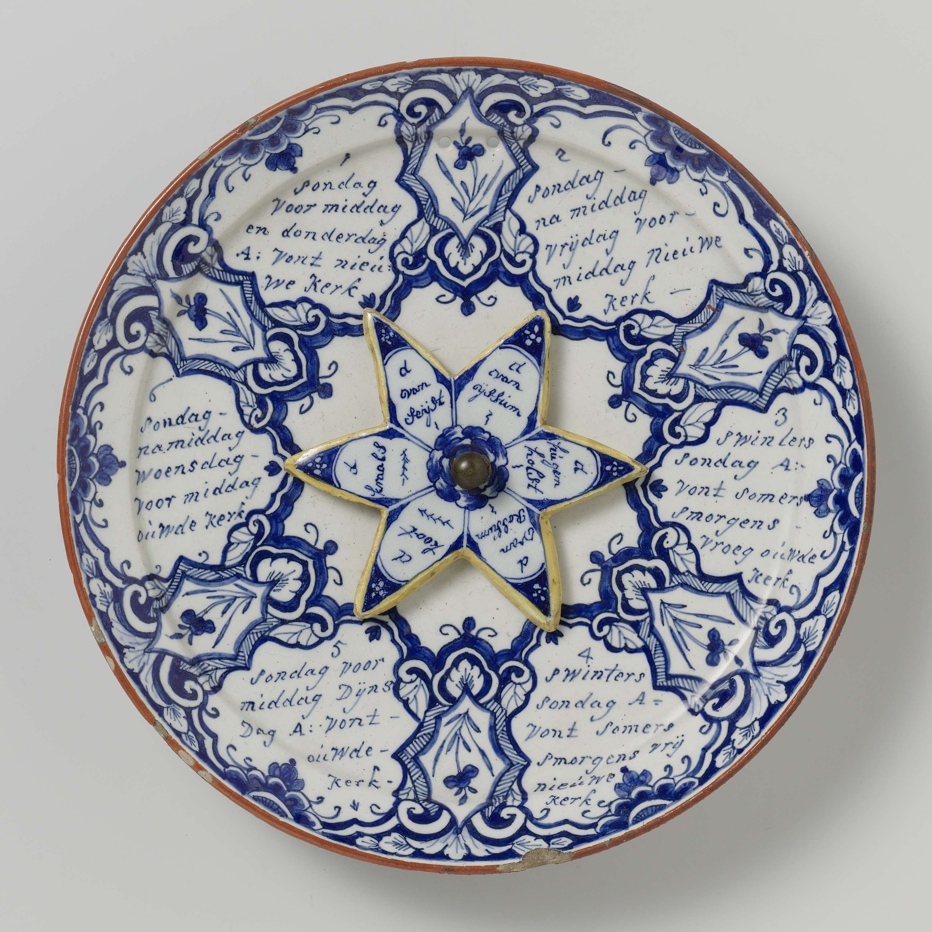 Bord van wit geglazuurd aardewerk met motief van draaiende ster, een inscriptie in blauw en andere ornamenten. Zogenaamd Predikbeurtenbord 1788-1805. Op het bord worden de namen van verschillende predikanten vermeld. (Nederlands)