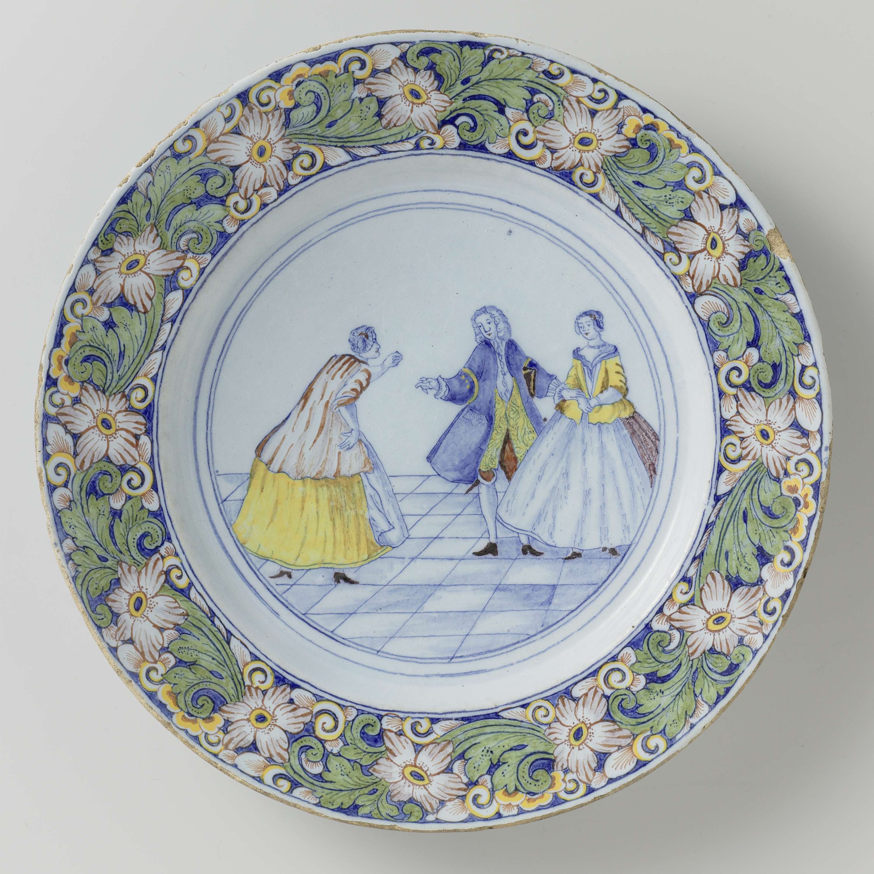 Bord van faience, veelkleurig beschilderd met drie figuren in een vertrek. (Nederlands)