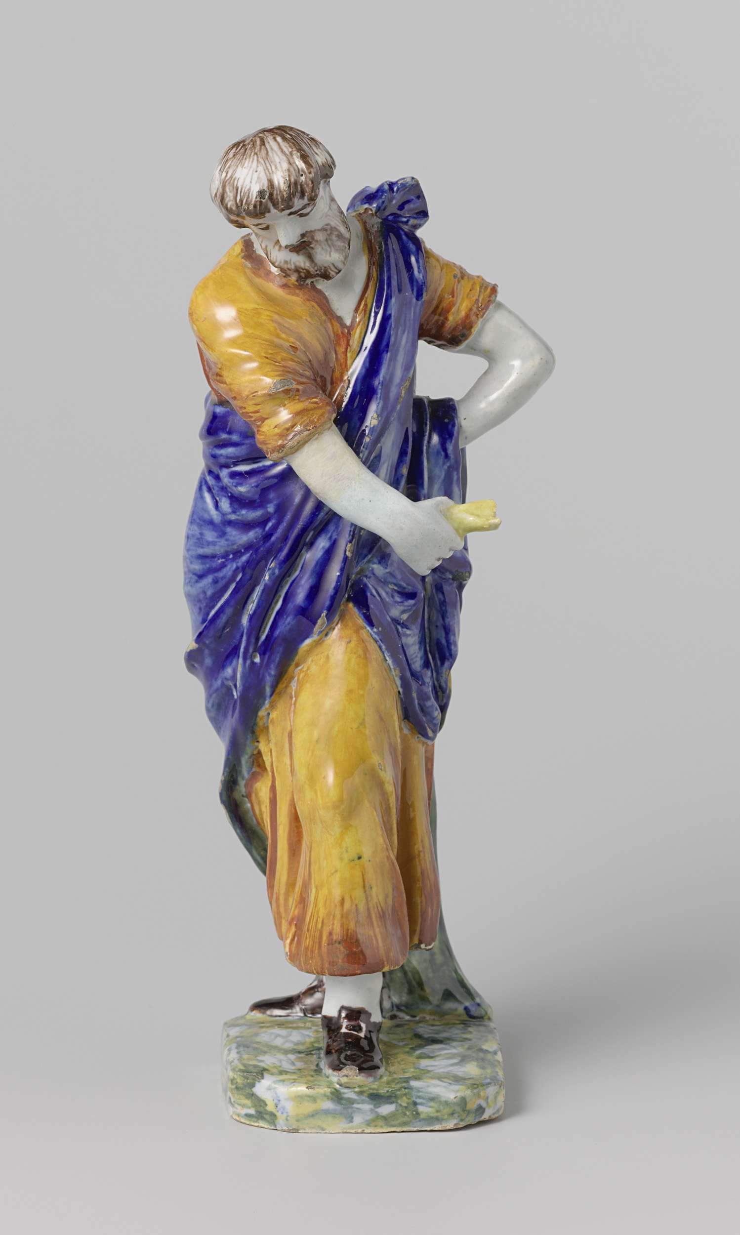 Mannenfiguur van faience, voorstellende een apostel met een boekrol in de hand. Veelkleurig beschilderd. (Nederlands)