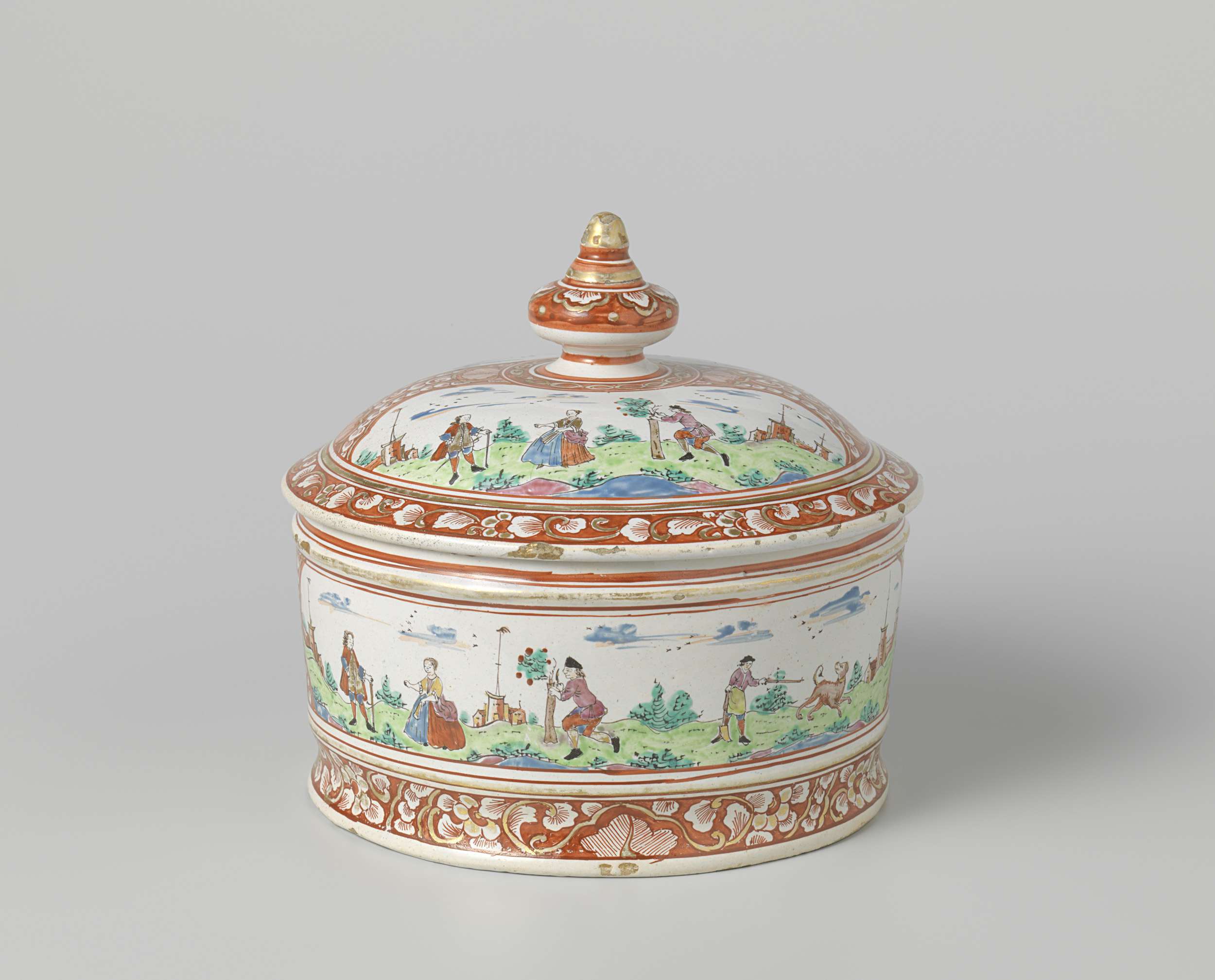 Tabakspot met deksel, veelkleurig beschilderd met een doorlopende voorstelling van figuren in een landschap. De randen beschilderd met een bloemrank. (Nederlands)