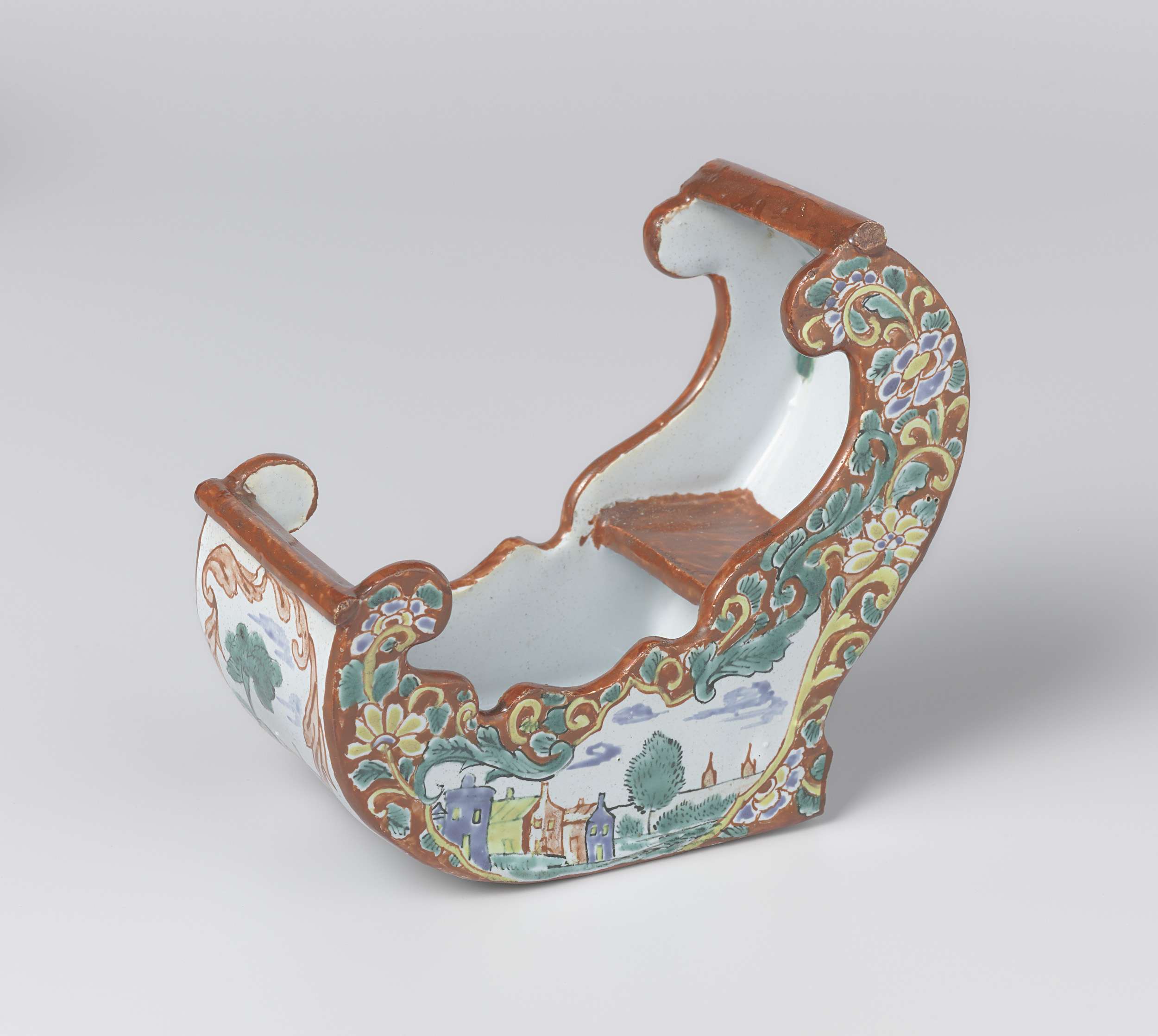 Pijpeslee met gebogen rug en geschulpte randen aan de zijkanten, veelkleurig beschilderd met waterlandschappen en een herder. (Nederlands)