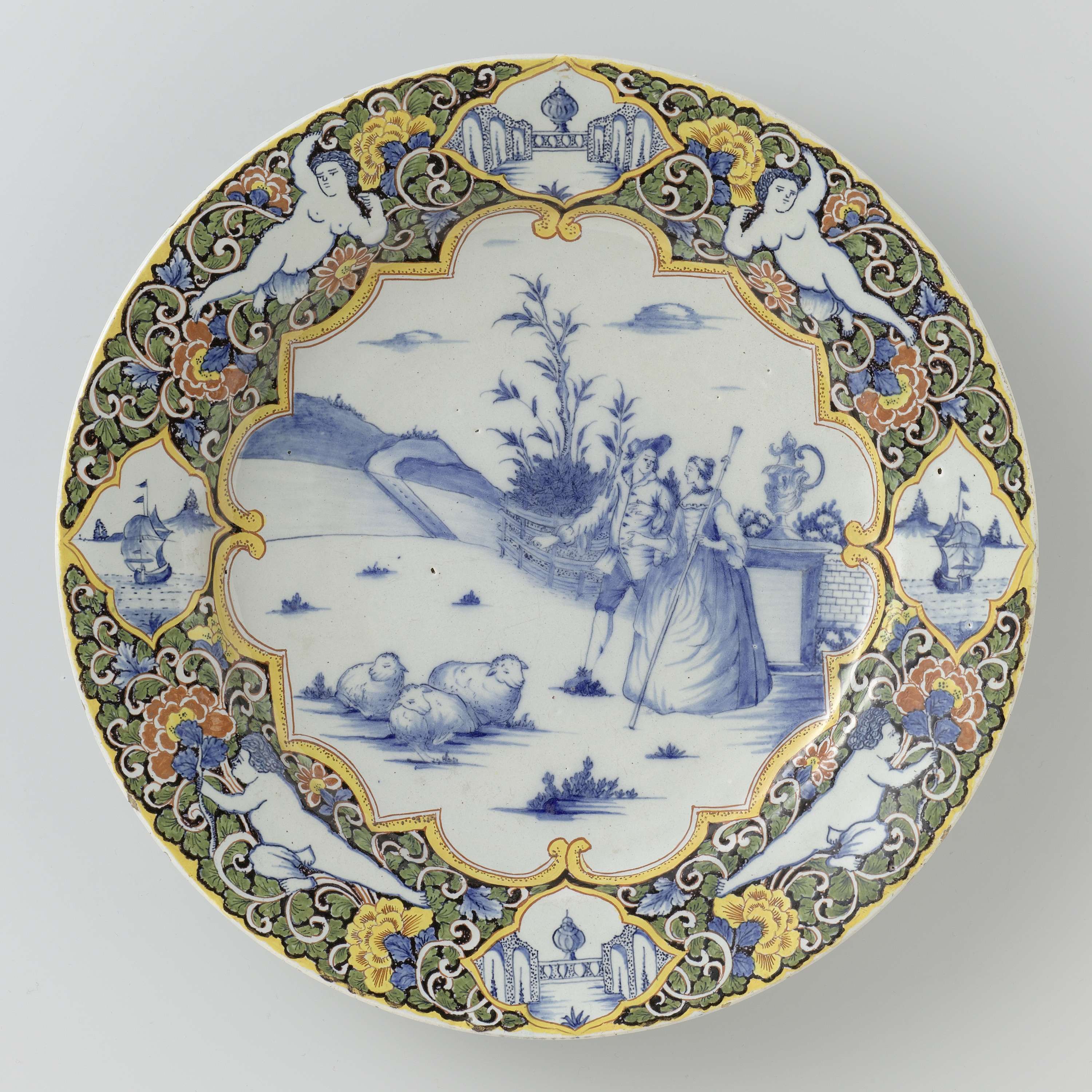 Schotel met op het plat in blauw een herdersscène binnen Louis XIV rand. Veelkleurige randversiering op zwarte grond met putti en vier medaillons (Nederlands)