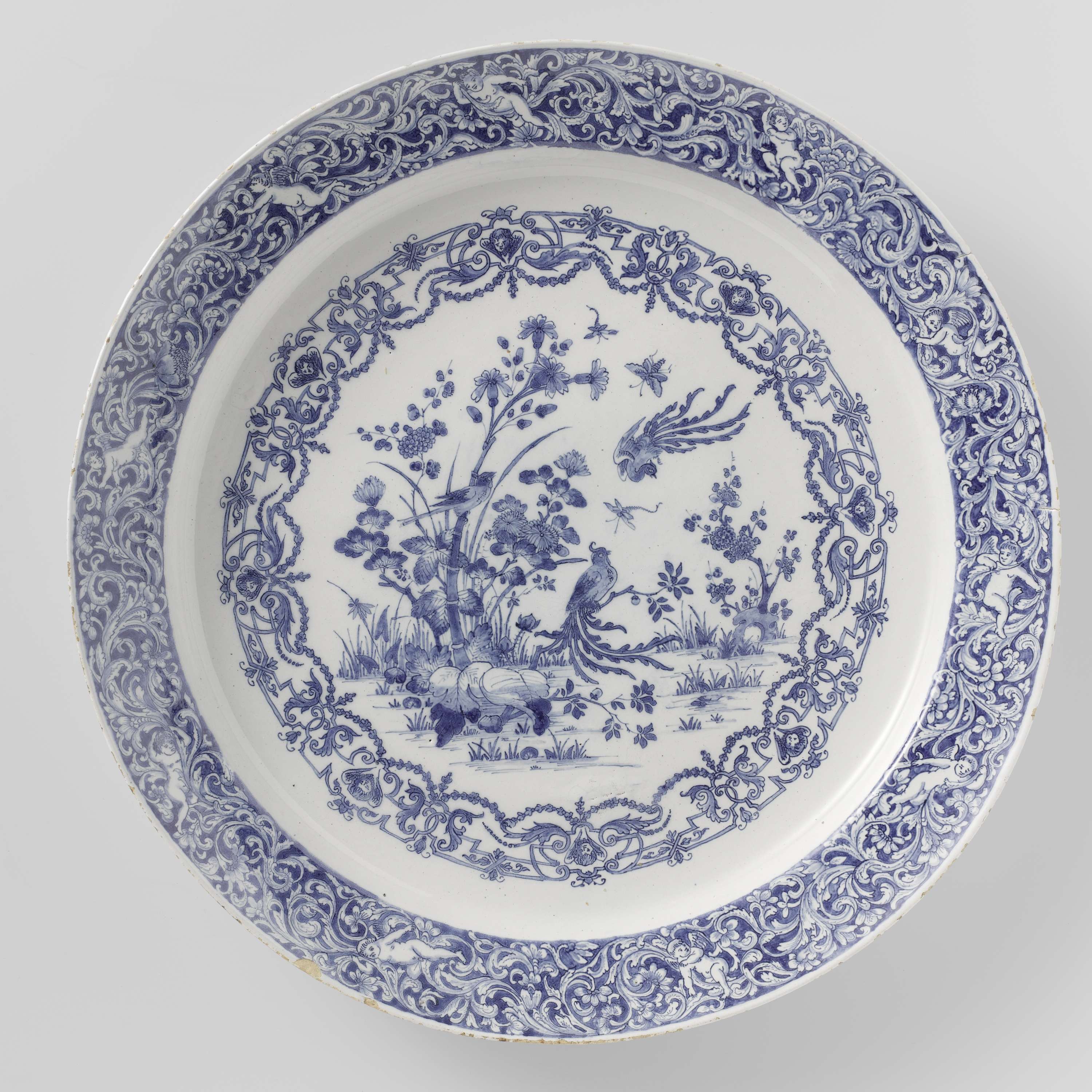 Schotel van aardewerk, beschilderd in blauw op wit tinglazuur. Op het plat bamboe en andere plantmotieven, met vogels in kakiemon stijl binnen een rijke rand, bestaande uit Bérain-motieven, churbkopjes en guirlandes. Op de brede rand bloem- en rankmotieven met putti, uitgespaard in een blauw fond. (Nederlands)