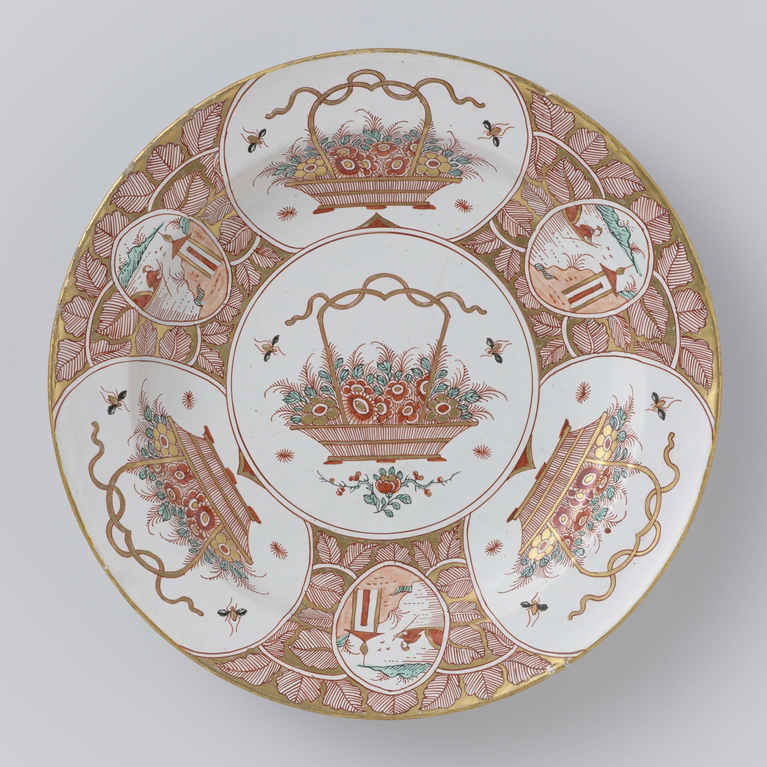 Bord veelkleurig beschilderd met op het plat een mand met bloemen in een medaillon. Op de rand hetzelfde patroon. (Nederlands)