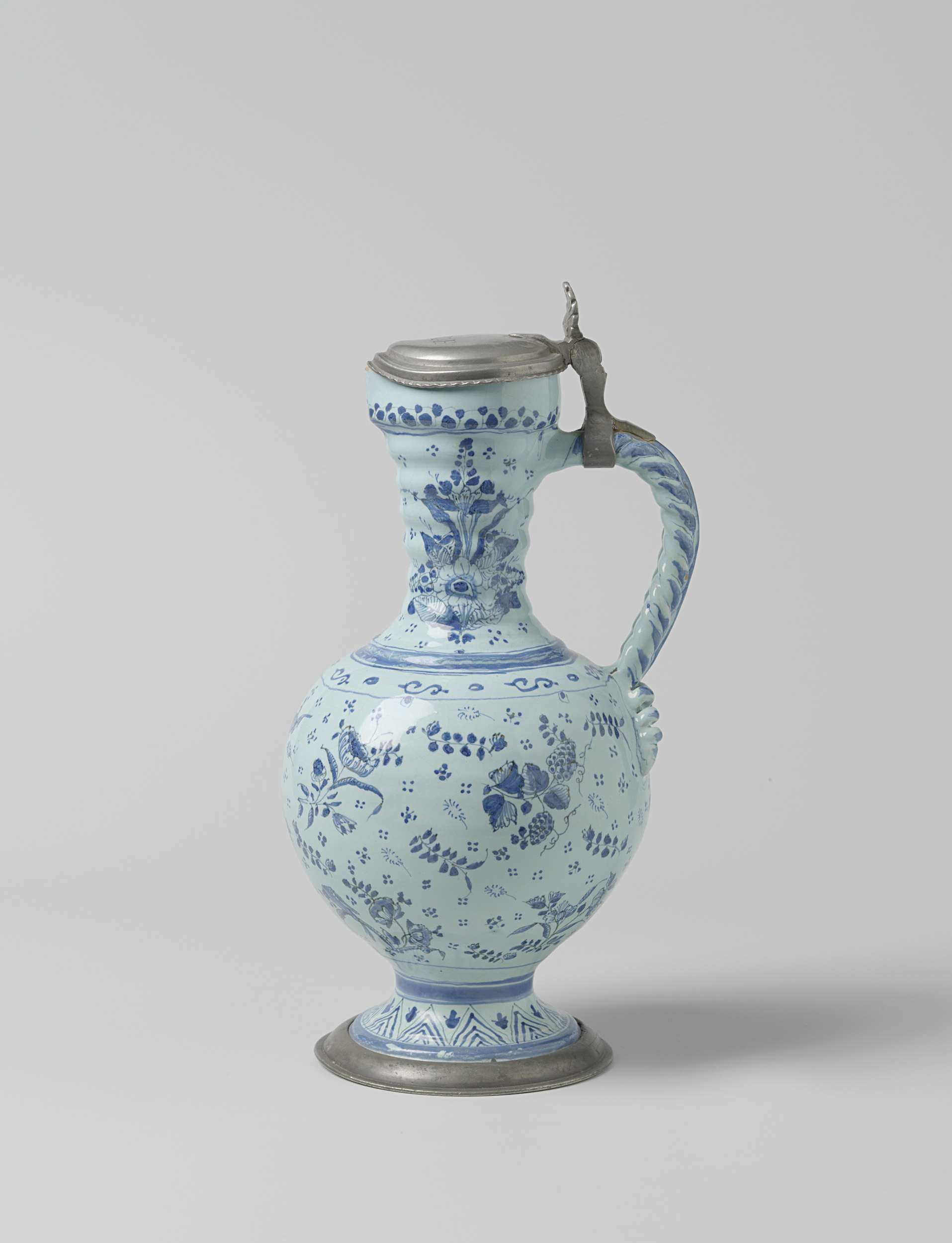 Kan van blauw beschilderde faience, met een blauwe fond, een tinnen voetring en een tinnen deksel. De kan heeft een voet, een bolvormige buik en een cilindrische, geribde hals. Het oor is gevlochten en eindigt in twee krullen op de buik. Op de kan is een strooimotief geschilderd bestaande uit bloemen, vogels, takken met bladeren en vruchten, een pauw en rozetjes. In de bovenkant va het deksel zijn de letters M.C.H. gegraveerd. De kan is gemerkt. (Nederlands)