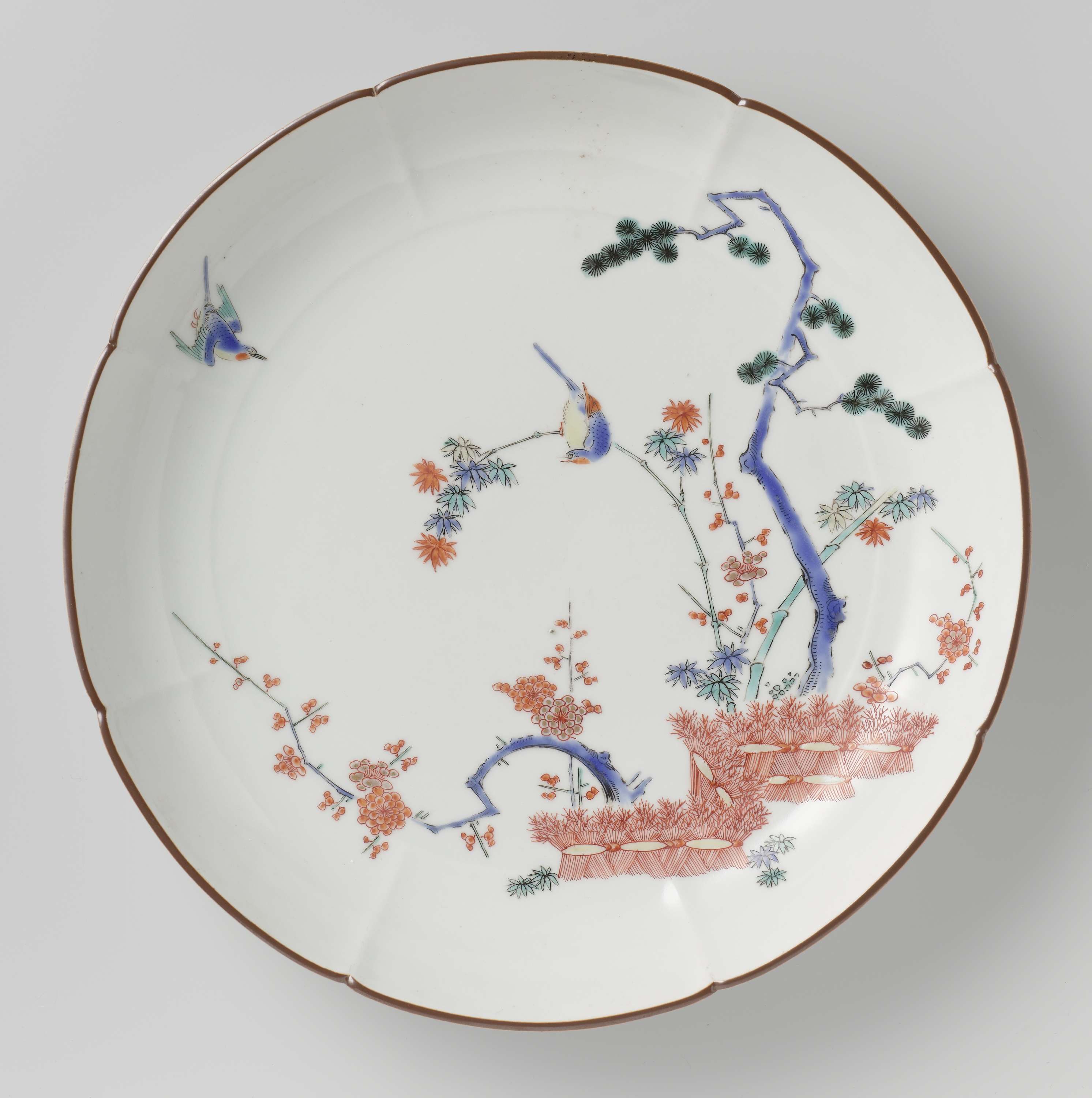 Bord van porselein met achtlobbige rand, beschilderd op het glazuur in blauw, rood, groen, geel, zwart en goud met de 'drie vrienden van de winter' (bamboe, prunus, pijnboom) bij gebonden heggen. Op de bamboe een vogel en ook een in de lucht. Bruine rand. Vijf proenen in de voetring. Oud label op de onderzijde met 'Collectie Westendorp/ 3'. Kakiemon. (Nederlands) | |||||||||||||||
