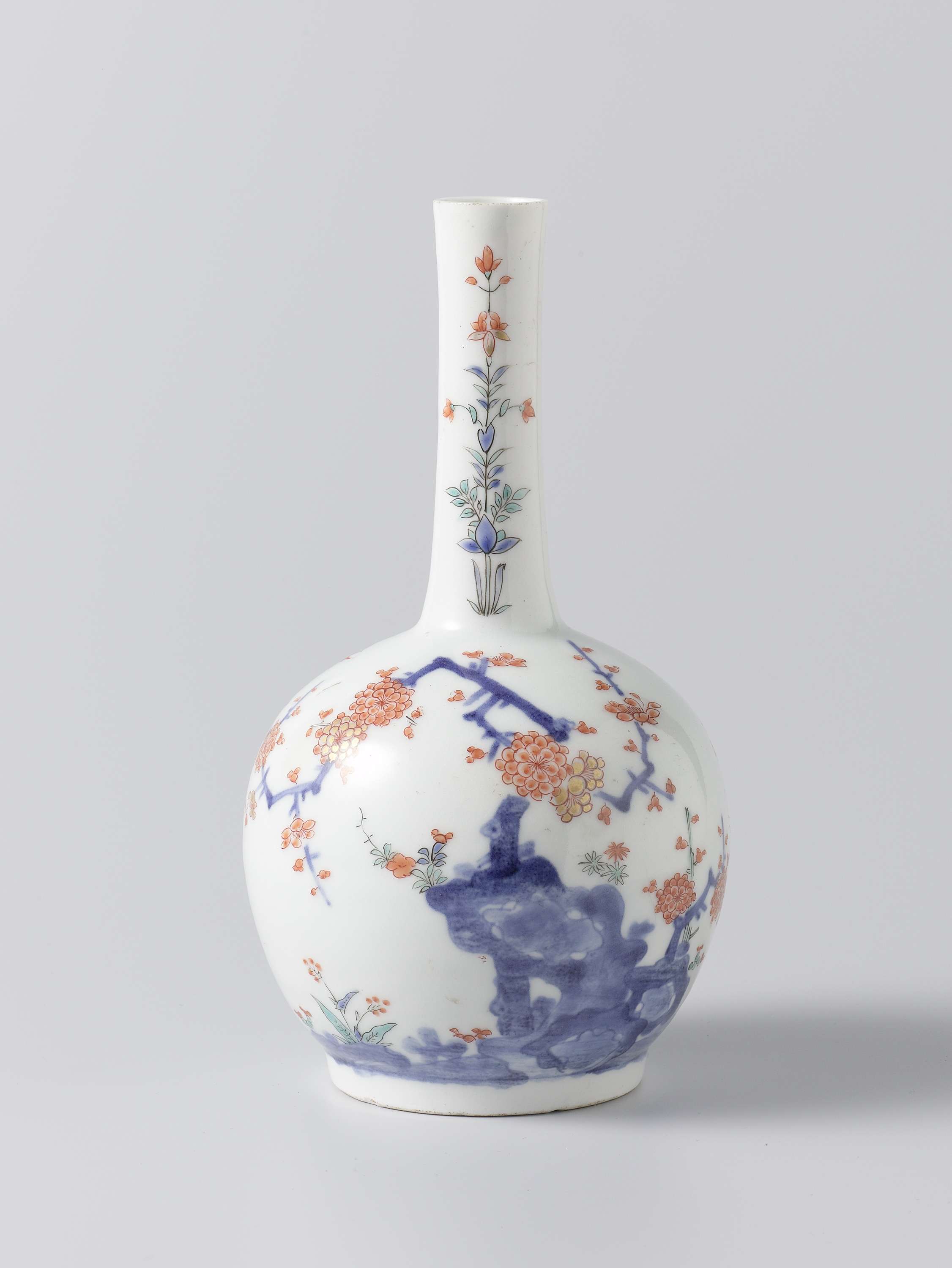Fles van porselein, bolvormig met lange cilindervormige hals. Beschilderd in onderglazuurblauw, blauw, rood, groen, zwart en goud met prunus en bamboe bij rotsen, een vogel en wolken; op de hals twee bloemtakken. Kakiemon-decor (Nederlands) | |||||||||||||||