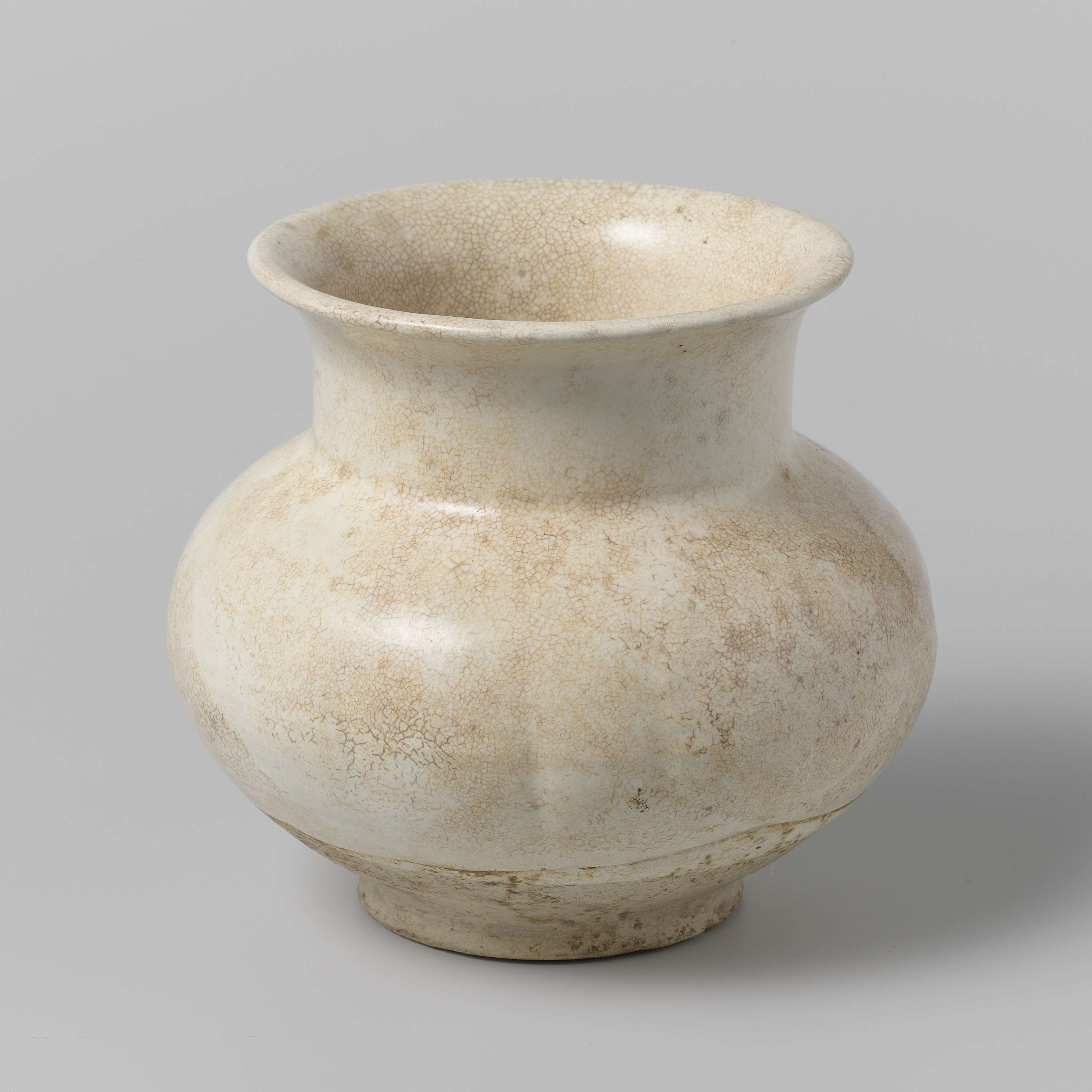 Pot van het Juluxian-type met een grijze scherf; wit, gedeeltelijk bruin geworden gecraqueleerde glazuur. (Nederlands)