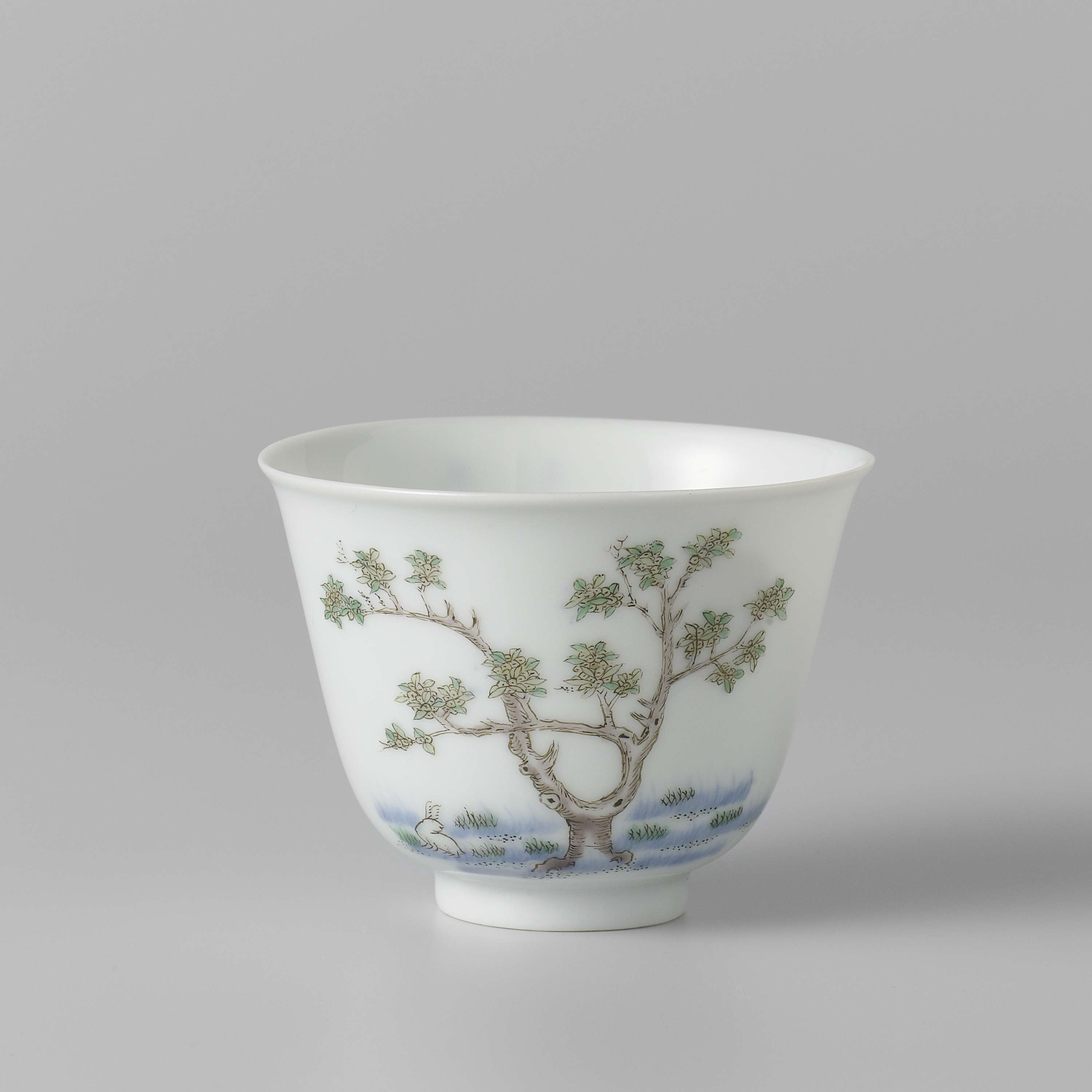 Klokvormige kop van porselein, beschilderd in onderglazuur blauw en op het glazuur blauw, rood, groen, geel, aubergine en zwart. Maandkopje van de achtste maand met op de buitenwand een osmanthusboom en een tweeregelig gedicht afgesloten door het zegelmerk 'shang', waardering. Gemerkt op de onderzijde met het zes-karaktermerk van keizer Kangxi in een dubbele cirkel. Porselein met emailkleuren. (Nederlands)