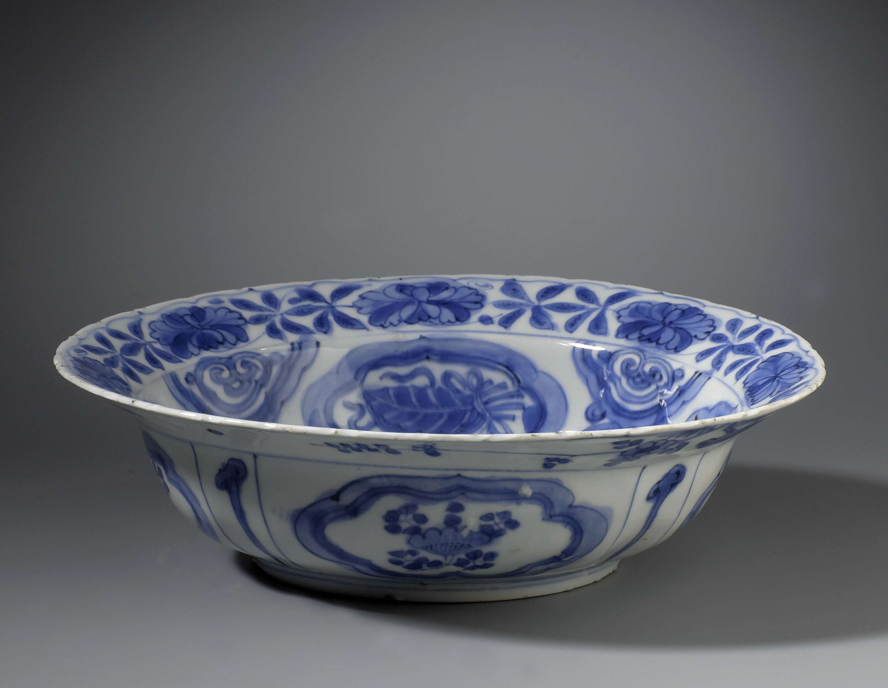 Klapmuts kom van porselein met een geschulpte rand, beschilderd in onderglazuur blauw. Op de bodem twee mensen in een rivierlandschap met bergen, bomen en paviljoens; de wand met vier geschulpte cartouches met een bloemtak of geluksvoorwerp (artemisiablad, palmblad), tussen de cartouches een ruyi-motief; de binnenrand met pioenranken; de buitenrand met tweemaal een vogel op een bloeiende plant (prunus); de buitenwand met vier geschulpte cartouches met een perzik- of bloemtak afgewisseld met rechthoekige vakken met een ruyi-scepter. Een chip in de rand. Kraakporselein in blauw-wit. (Nederlands) | |||||||||||||||