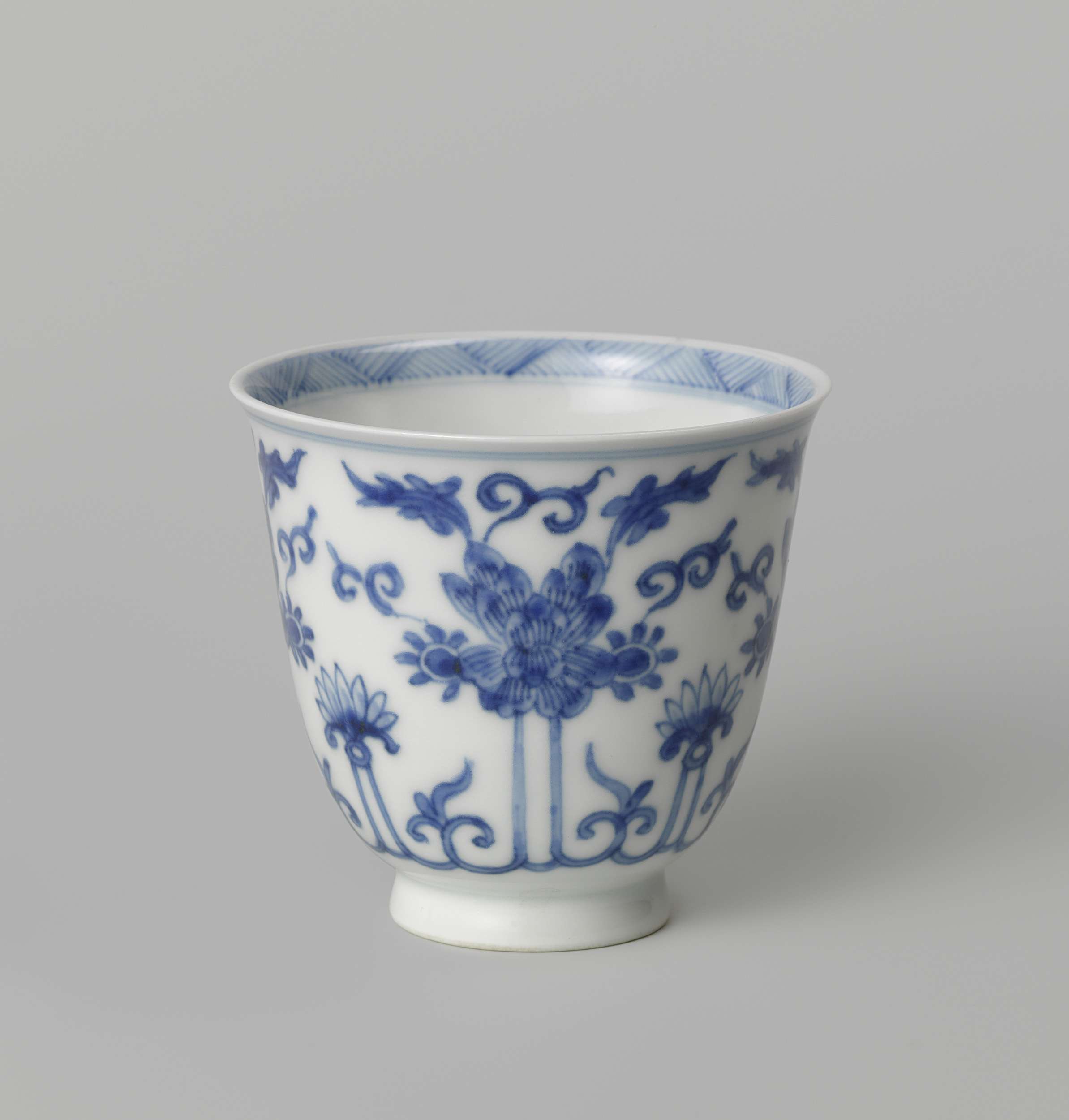 Klokvormige kop van porselein, beschilderd in onderglazuur blauw. Op de buitenwand een sterk gestileerde doorlopende lotusrank. De bodem met een gestileerde tak in een dubbele cirkel. Op de binnenrand een band met arceerwerk. Blauw-wit. (Nederlands)